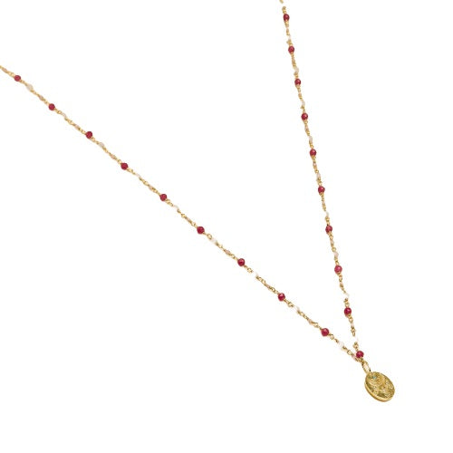 India shaded long necklace, our revisited India chain, on a brass base gilded with 1 micron fine gold, stones of different sizes in shades of pink and a small engraved medallion.