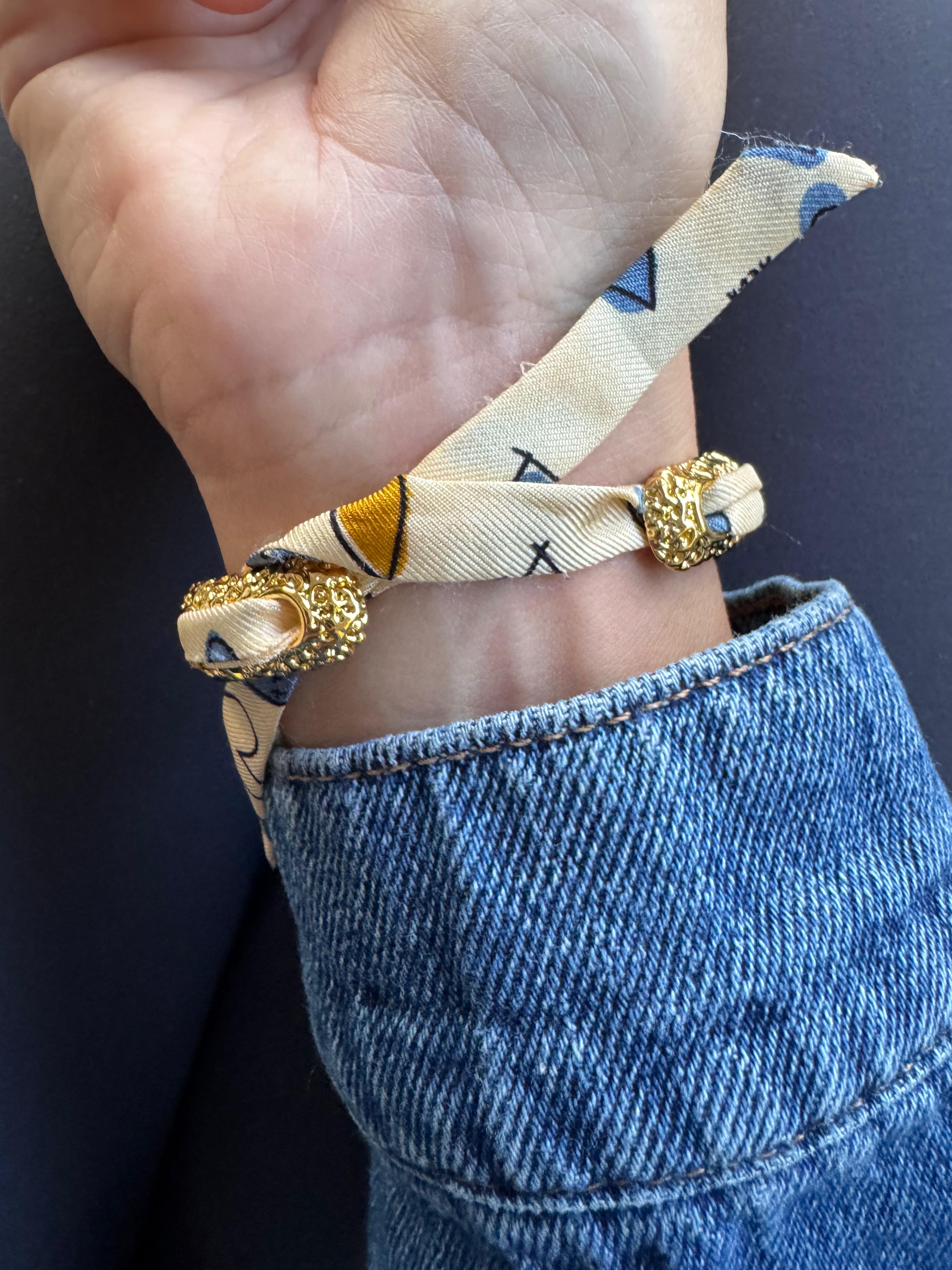 The Les Mots Bleus ribbon is a celebration of tenderness and joy, adorned with hand-drawn hearts in shades of blue and golden yellow on a soft cream background. Its playful yet poetic design carries both warmth and lightness, making it an accessory full of charm and character. Romantic and expressive, it’s a ribbon that speaks the language of love in vibrant color.