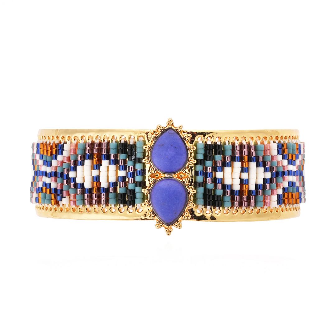 A sumptuous 14-carat gold-plated copper beaded bracelet, FRISCO is entirely hammered and comes in four colors. Beautifully hand-woven with seed beads, it features a graphic motif with Native American accents. Available in shades of petrol blue, klein blue, bronze and white for the indigo version, it seduces with its refined color palette. The central cabochon, adorned with two mirrored indigo drops surrounded by a meticulous ball setting, adds a touch of elegance. Whether worn alone or with other color variations, the FRISCO bracelet is a must-have