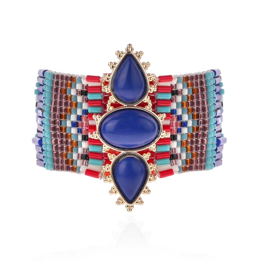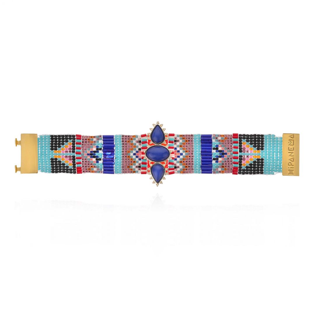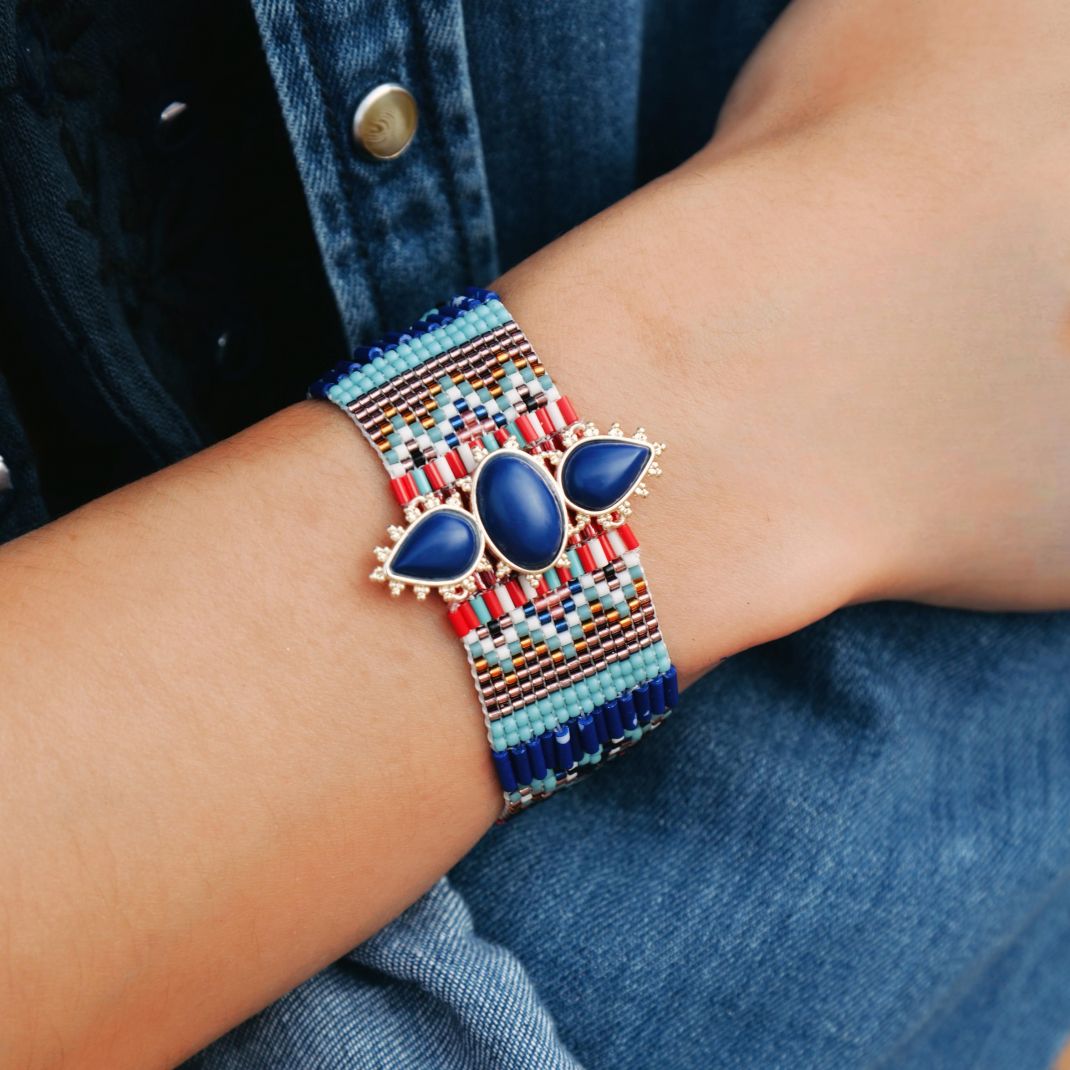 Iconic and irreplaceable, the HIPANEMA cuff crosses collections, constantly reinventing itself. This winter, it's called NOLITI and comes in four colors, offering a multitude of combinations to perfectly match the hues of your autumn wardrobe. In its indigo version, it features a weave of seed beads in Navajo-inspired geometric patterns in shades of lapis blue, red and white. In the center, a sumptuous cabochon stands out, composed of three shapes: an oval and two indigo drops, entirely set with a precious ball-effect closed hoop, visible all around. Closed with the indispensable magnetized clasp, it becomes one of the highlights of this collection.