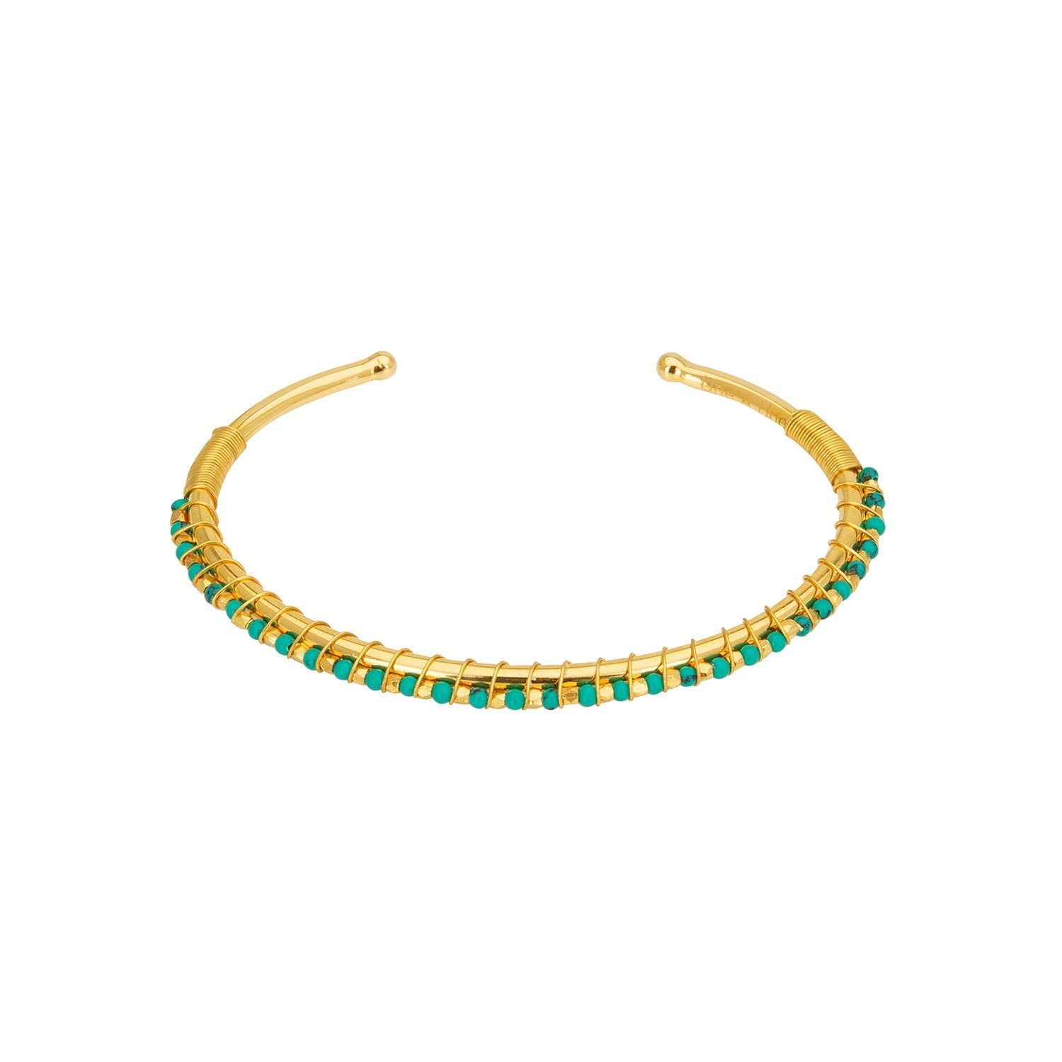 The Jaipur bangle, in a brass base gilded with 1 micron 18-carat fine gold, on which small nuts and round beads in turquoise-colored agate are wound.