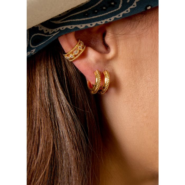 The MADURAI earrings by MYA-BAY are inspired by the poetic and intricate architecture of Madurai, India. Gilded with recycled 24-carat fine gold and measuring 1.5 cm, they reinvent the classic small hoop with a sculptural twist. Unique without being too bold, they adorn the ear with elegance and character. A jewel that evokes travel, art, and individuality. Pair with the LADY rings for a sculptural, organic-chic combo.