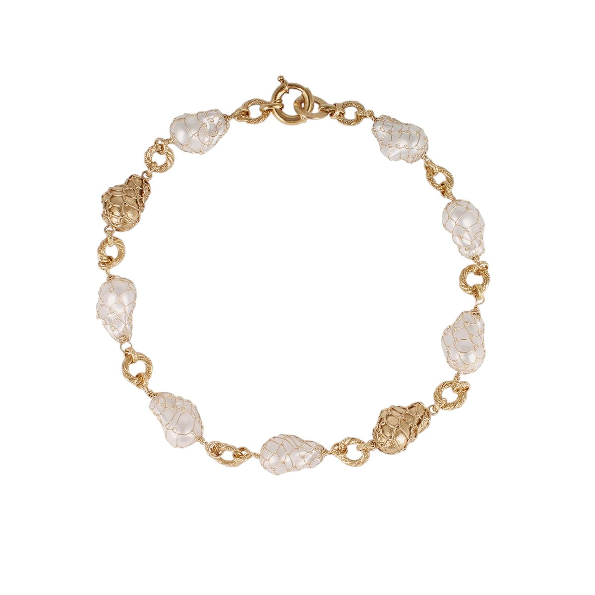Gold-plated necklace, composed of fine rings assembled with delicate, light pearly resin beads mounted on a dormeuse, they are wrapped in a single gold-plated thread reminiscent of fishing nets. This refined model is characterized by its lightness, offering a modern, timeless aesthetic inspired by organic stones in the shape of a drop of water.