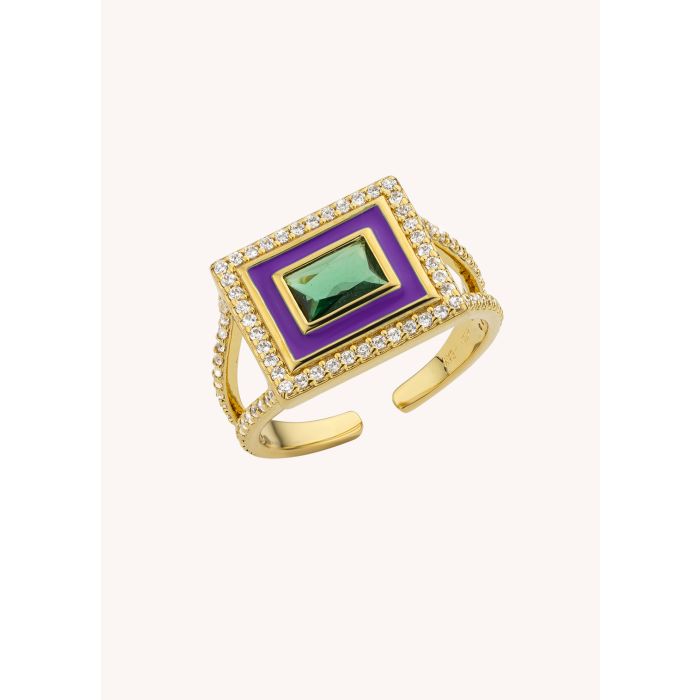 The PURPLE EL PASO ring by MYA-BAY is gilded with recycled 24-carat fine gold. Its deep violet enamel frames a vibrant center stone — a bold and elegant mix. A unique tone for those who like to stand out while staying refined. Complete your EL PASO vibe with the matching necklace or switch it up with the FUCHSIA EL PASO ring for an even bolder touch.