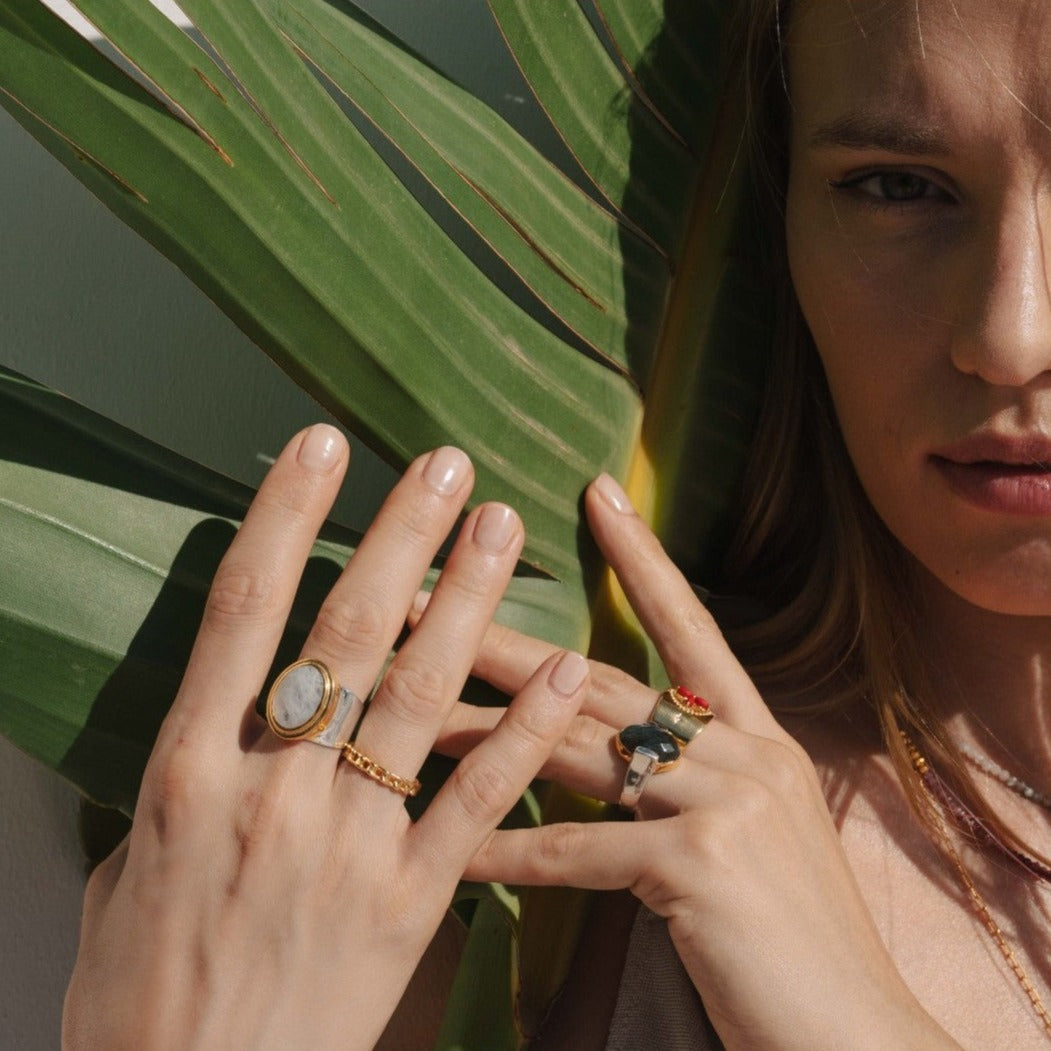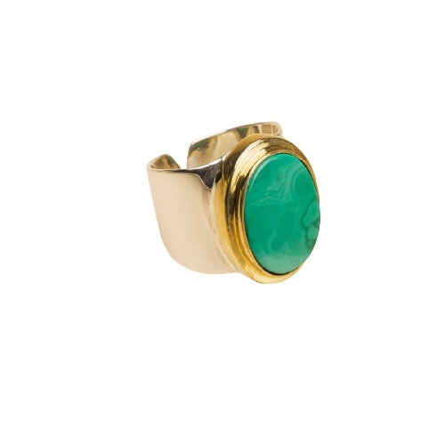 Machu Picchu ring, silver base 925 silver finish, adorned with a flat malachite stone set in a brass base gilded with fine gold 18 carats 1 micron.