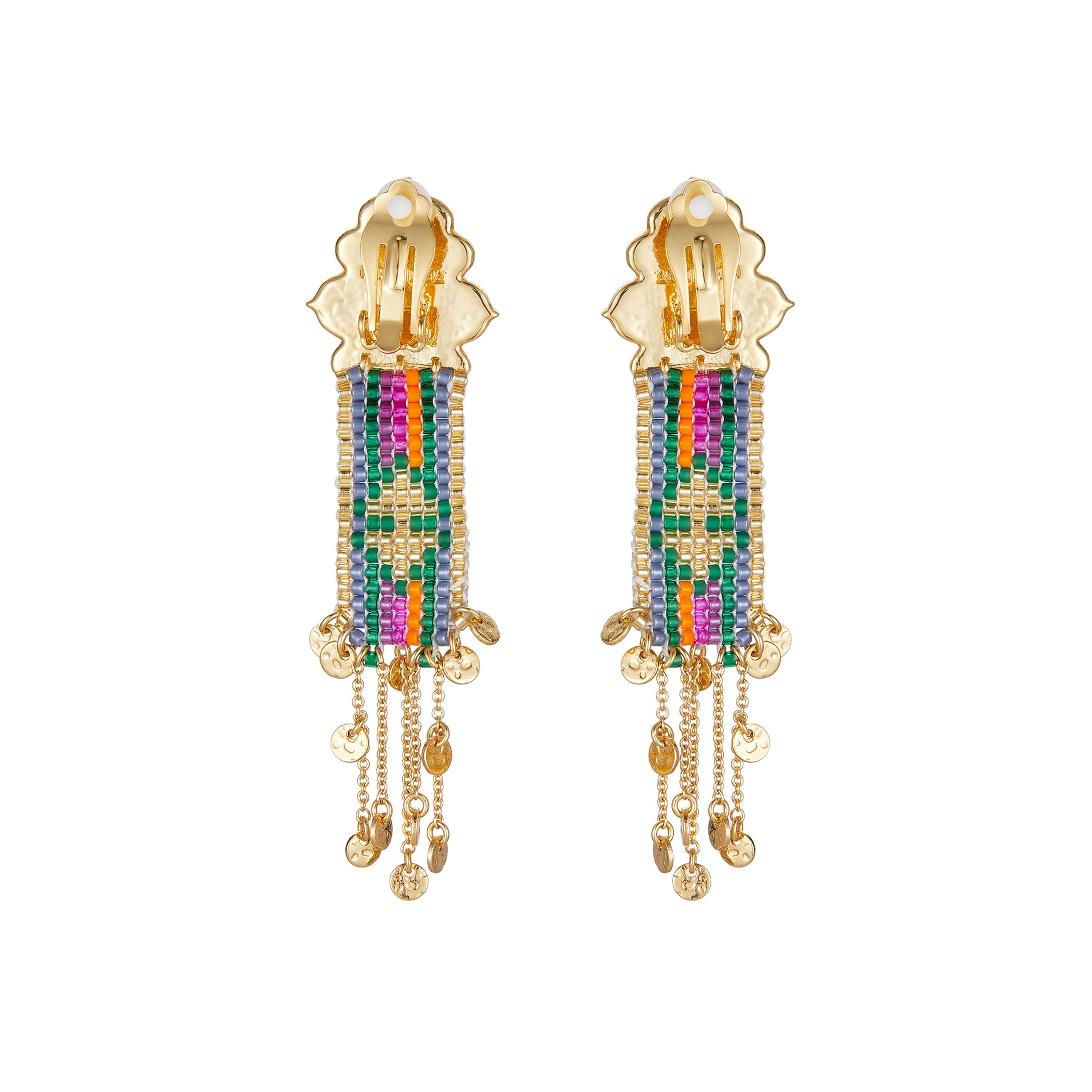 Clip-on earrings for pierced and non-pierced ears, in the center a Byzantine-inspired cabochon, decorated with a green malachite effect pearl. There is also a cartridge with a geometric design composed of seed beads in shades of green and fuchsia, overlooking a cascade of golden chains, decorated with tassels for an ethnic touch.