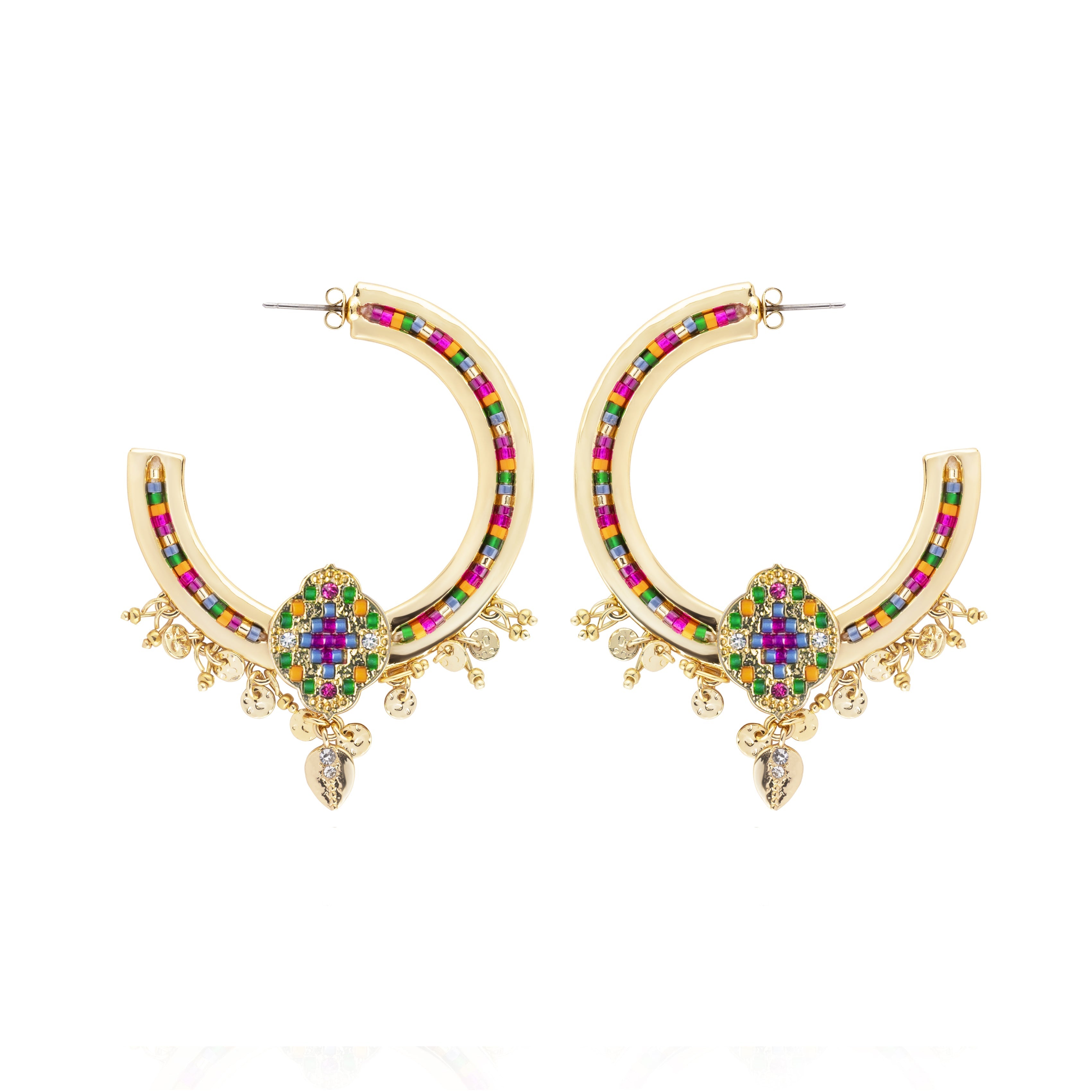 Generous hoop earrings gilded with fine gold, completely crafted with in their center a cabochon with a geometric pattern of seed beads in green and fuchsia tones, adorned with seed beads all over the semi-circle. We love the oriental-inspired touch of the little golden tassels.