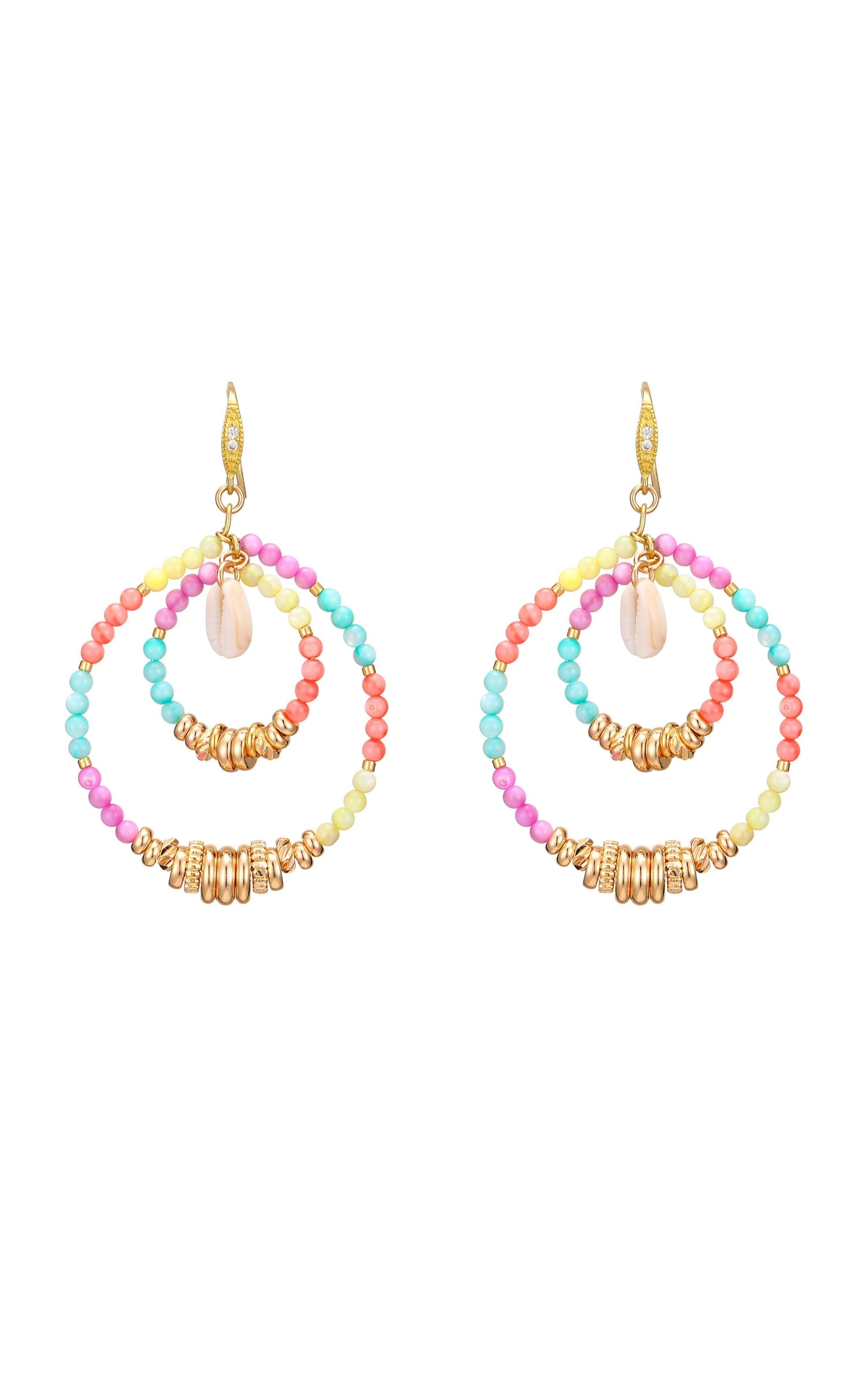 Icons of the Hipanema wardrobe and representative of the summer theme, these double hoop earrings on a rhinestone-set sleeper evoke the glow of a sun at its zenith and a bewitching turquoise sea. Delicate, colorful Miyuki pearls alternate with fine gold rondelles paved with rhinestones; in the center of each creole, a cylindrical piece completes the symmetry of the pearls, all adorned with an adorable cowrie shell. We love them without moderation!