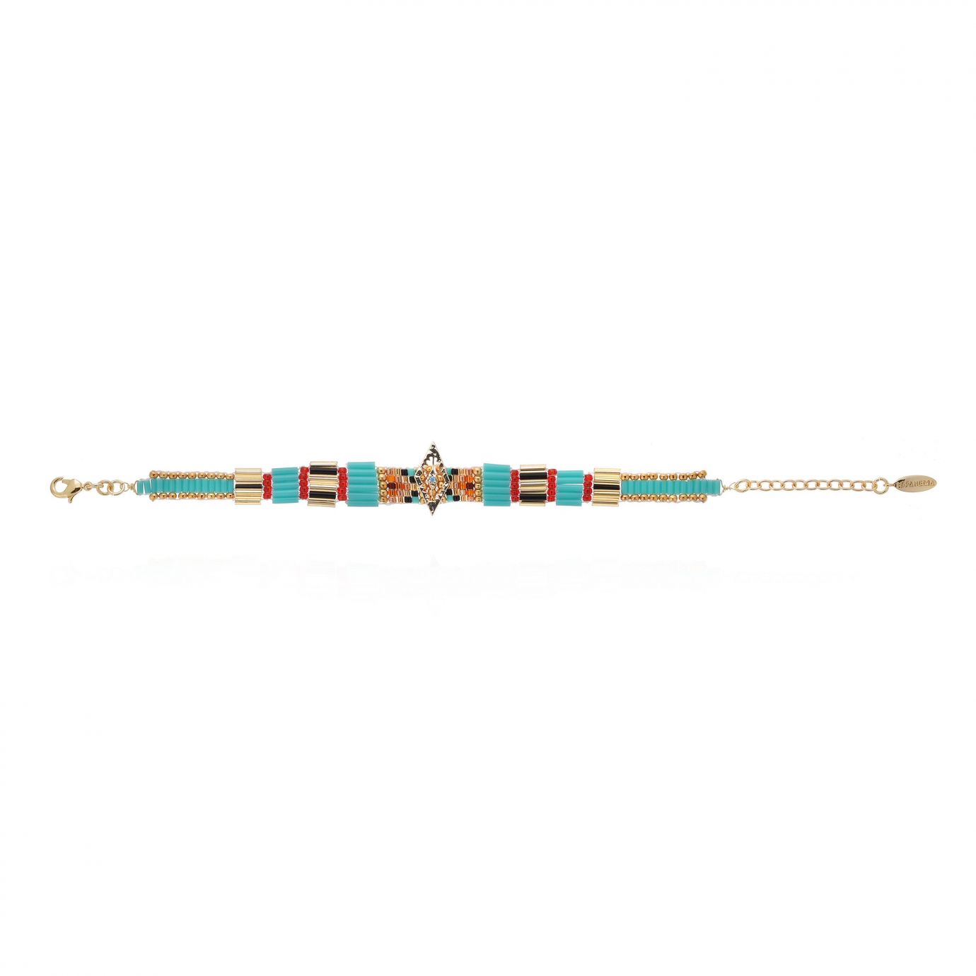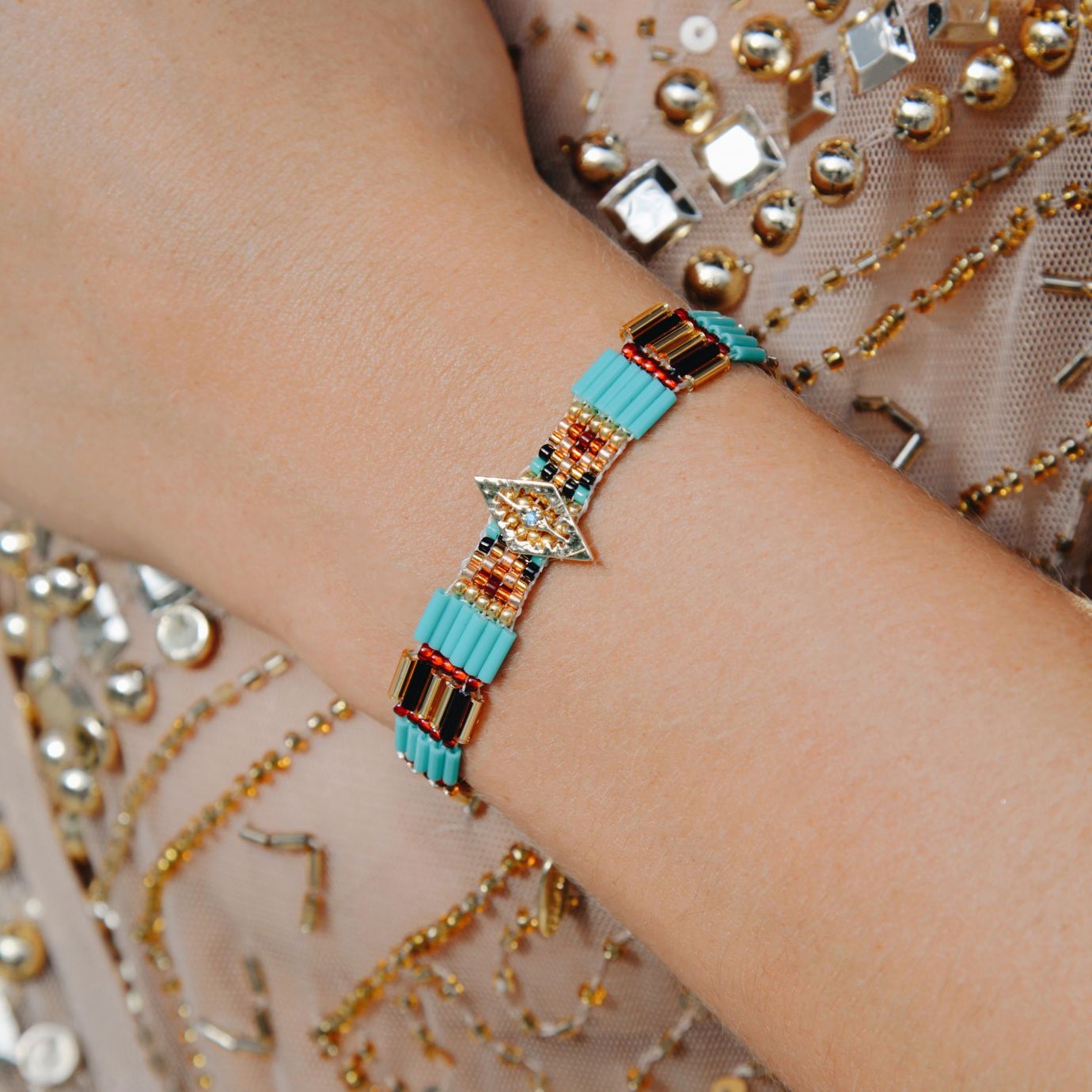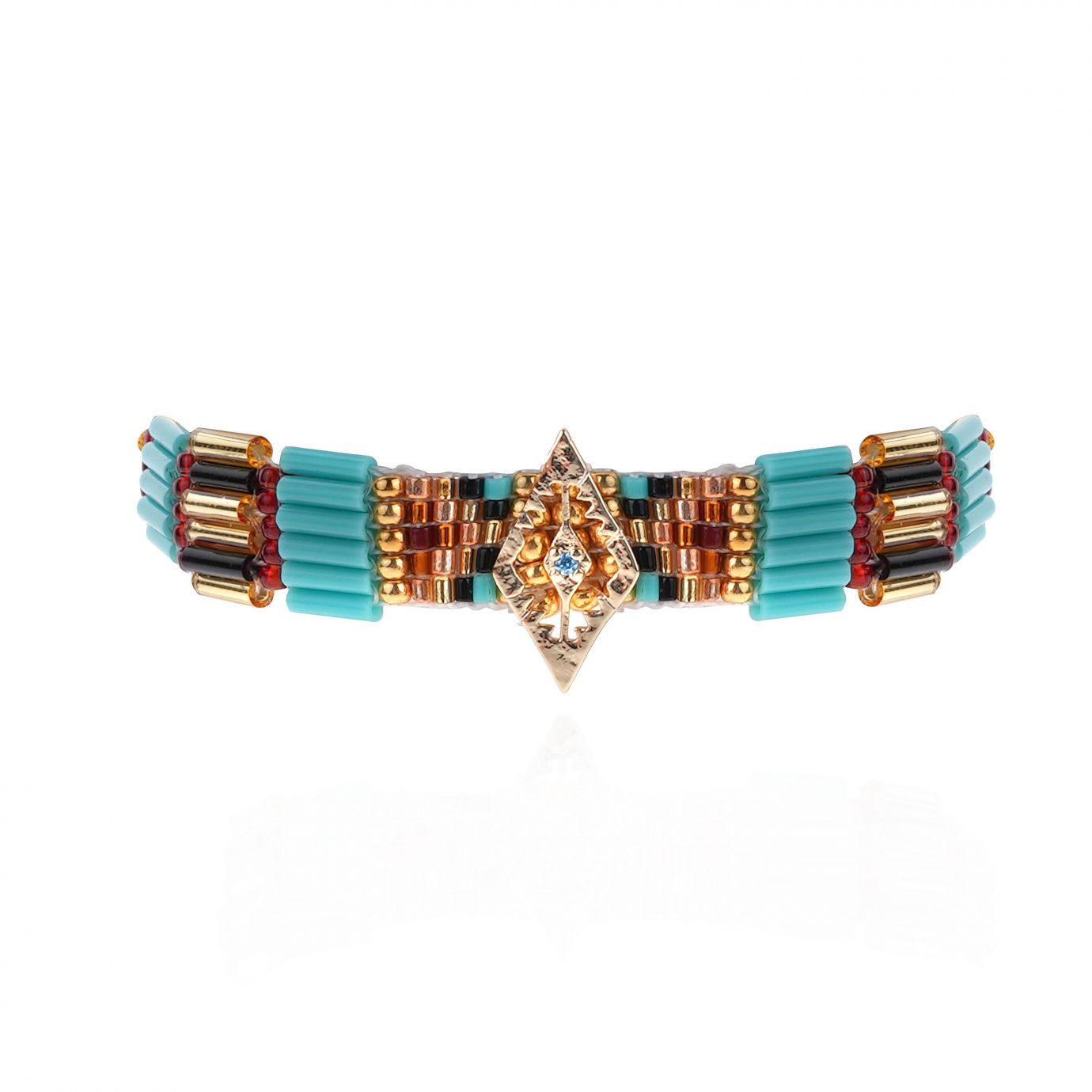At the heart of the Mayan inspiration behind the collection, the KAIA cuff is available in two colors, turquoise and indigo. The turquoise version features an adorable mix of tubular seed beads and small Miyuki pearls, in a range of lapis blue, turquoise, red, black and bronze colors. The exquisitely crafted center features a Mayan-inspired diamond shape, adorned with diamond-effect rhinestones.