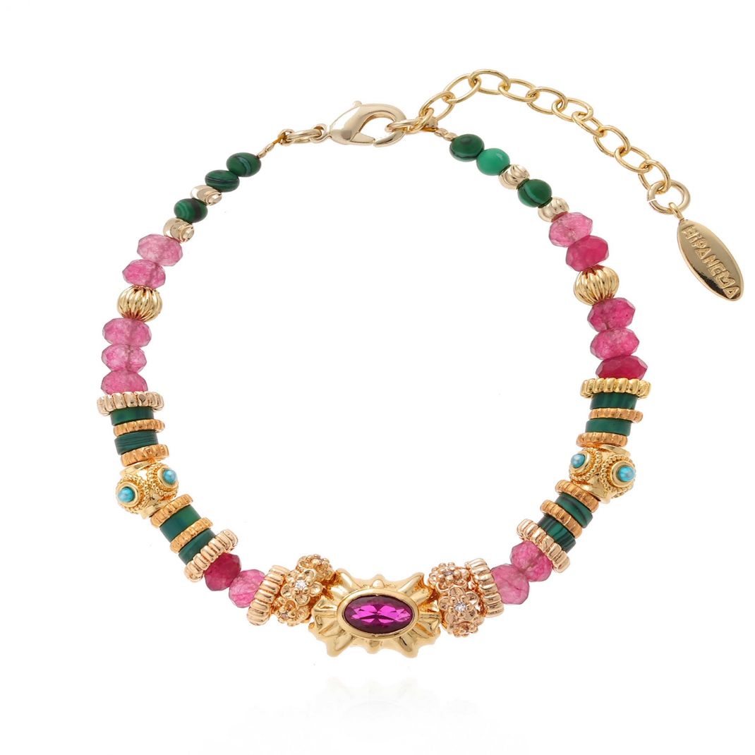 At the heart of HIPANEMA's DNA, the TAD bracelet, in copper gilded with 14-carat fine gold, is inspired by a sophisticated yet colorful style, making it an ideal winter piece. Composed of genuine malachite stones and pink spinel garnet, it offers a precious sparkle, enhanced by sequences of godron-inspired rondelles and delicate little pampilles wrought in green and pink tones, which elegantly dot the ensemble.