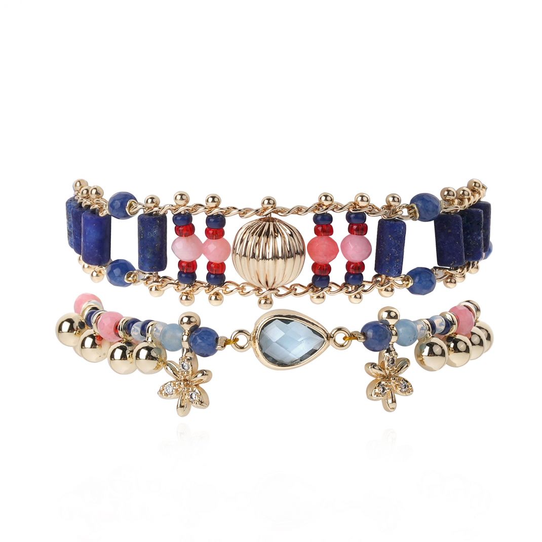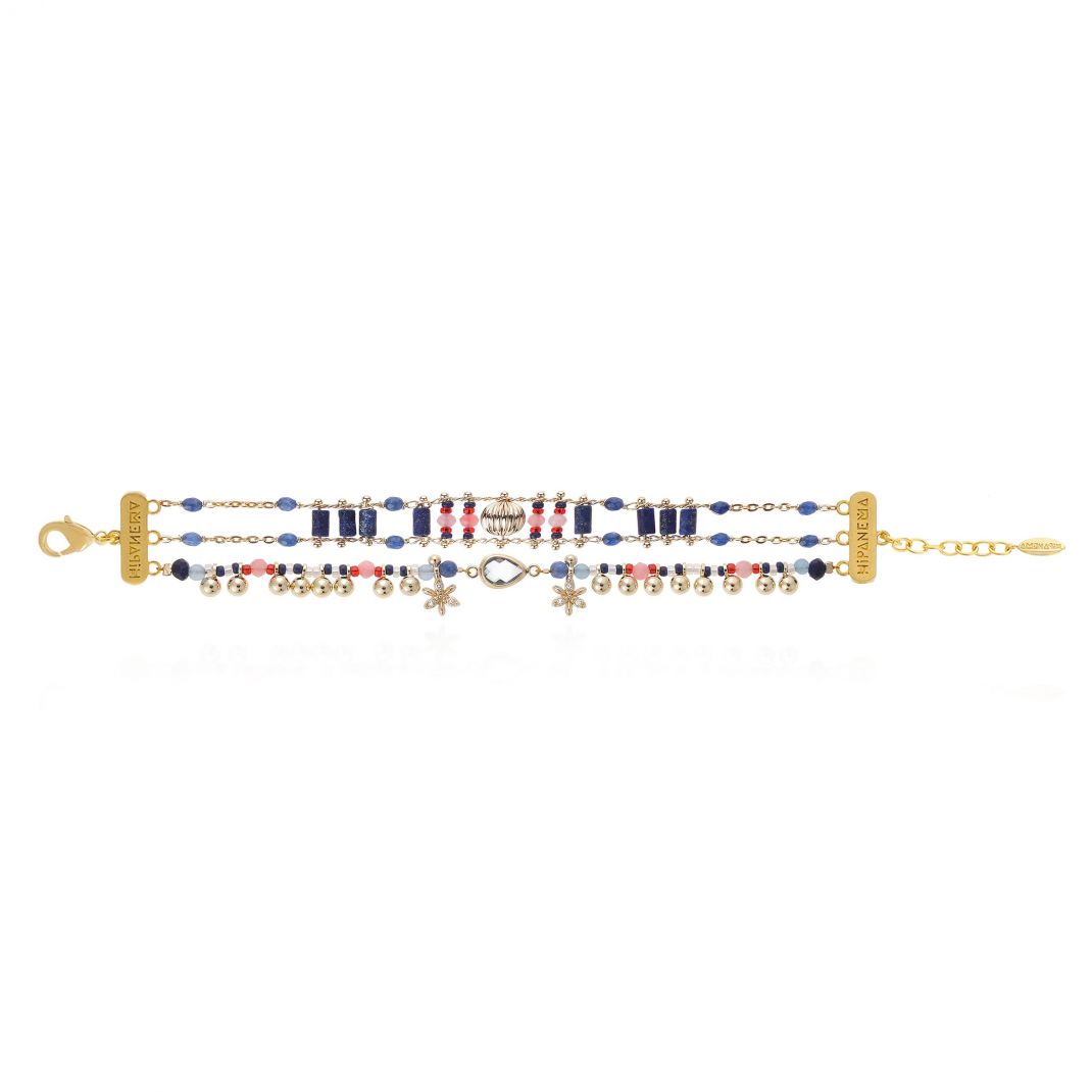 Divine multi-link, the BILBAO bracelet is inspired by the structure of a cuff and consists of three precious, elegant links. The first two, mirrored and linked by a delicate ladder assembly, combine a chapelet chain adorned with lapis-blue faceted beads and tubular pearls that frame a godron-inspired golden pearl in the center. The third link extends the harmony of the first two with a set of pearls in matching hues, embellished with meticulous tassels that sway lightly. To complete the refined balance of this jewel, a cabochon with irregular contours and a montana blue sheen enhances the ensemble, adding a final touch of character and sophistication.
