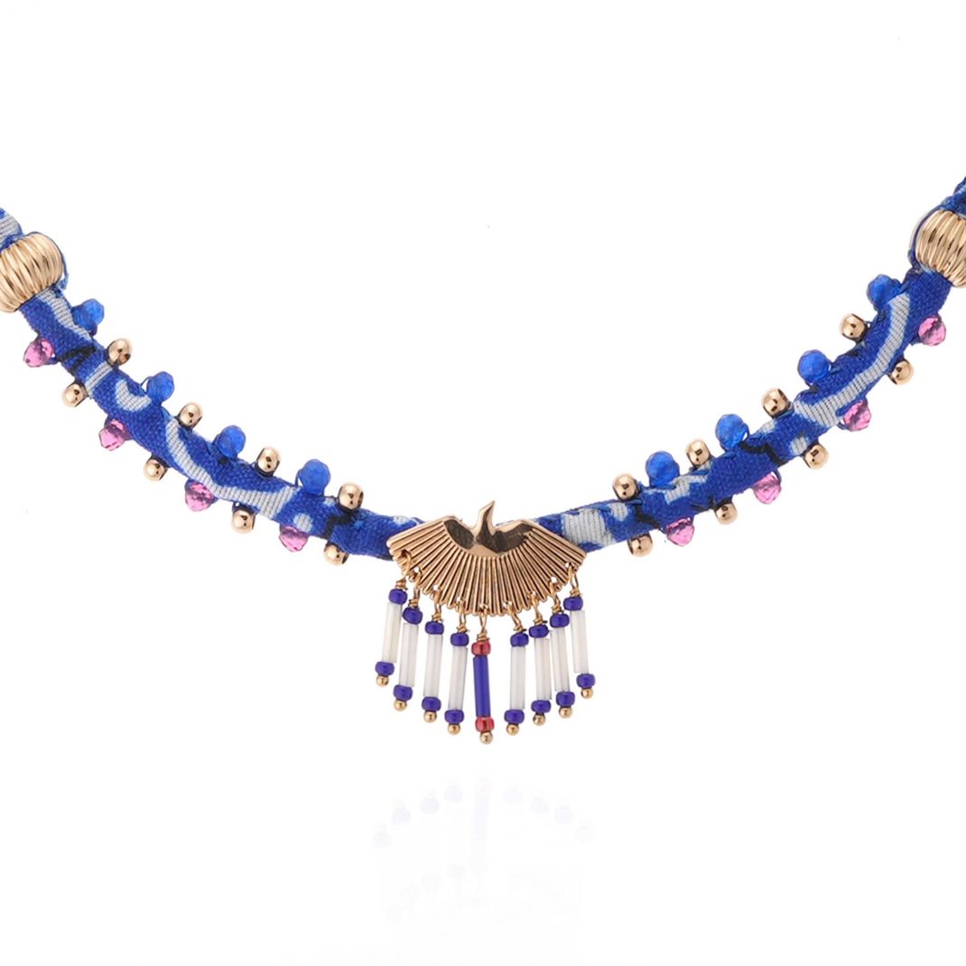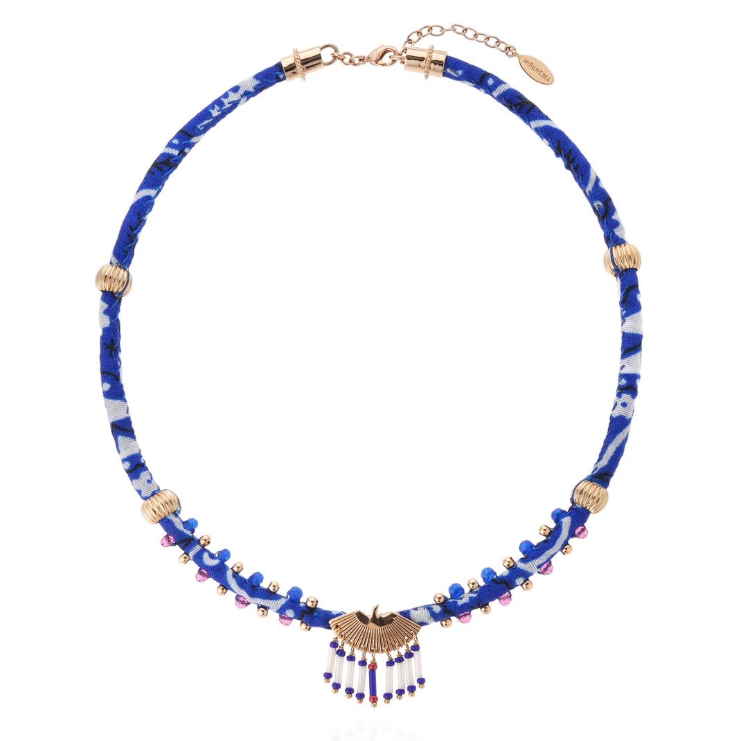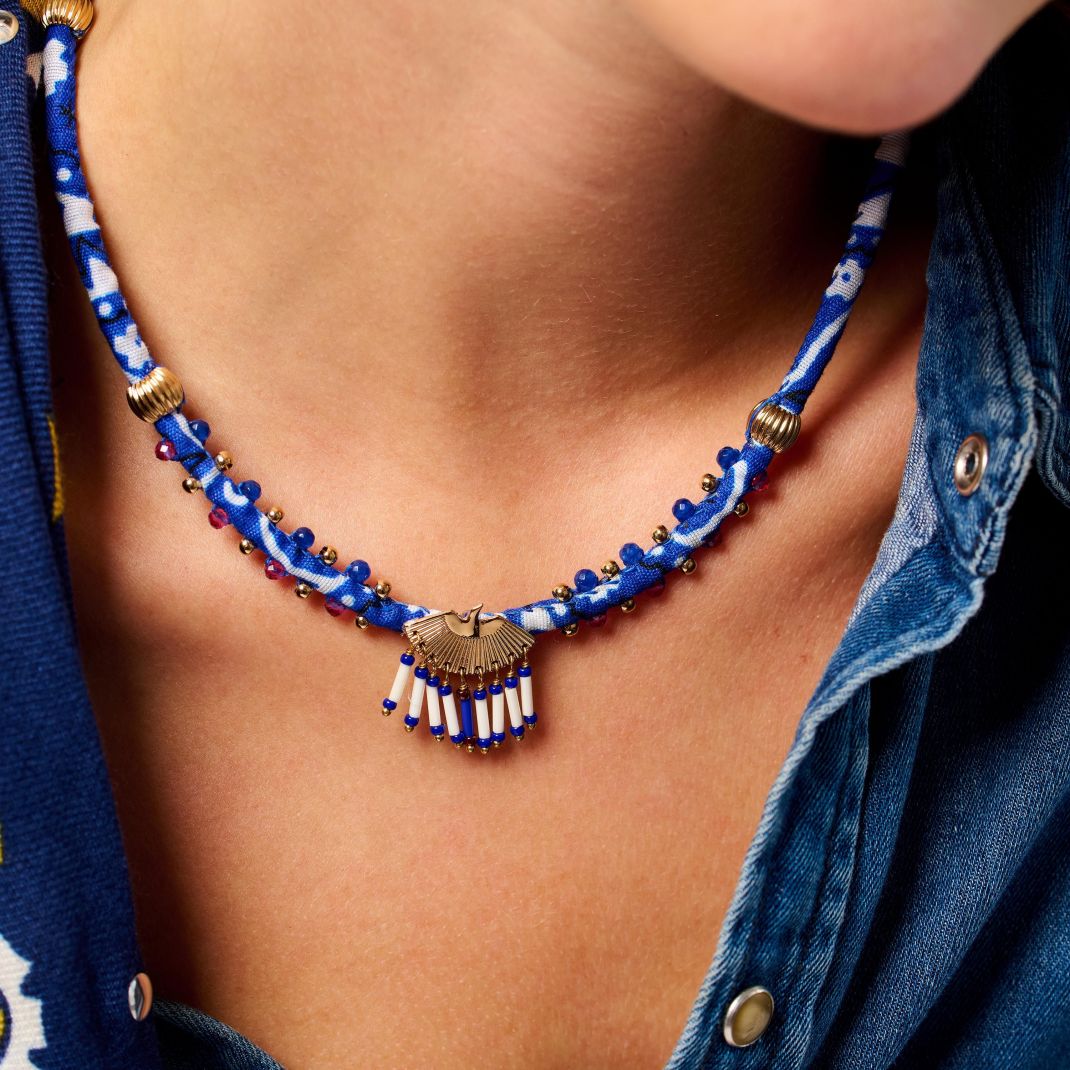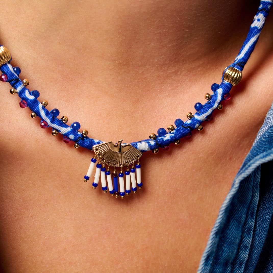 Imbued with the exceptional craftsmanship that gives our pieces that precious, unique Do It Yourself feel, the SWANNY necklace is built around a twisted bandana fabric on which delicate little pearls are sewn. The centerpiece is the collection's stylized eagle, whose fan-shaped tail is adorned with lapis blue and white tube pearls. A concentration of HIPANEMA's finest inspirations for this iconic necklace.