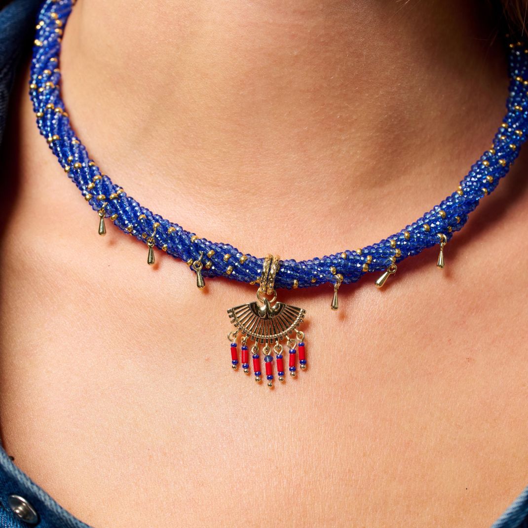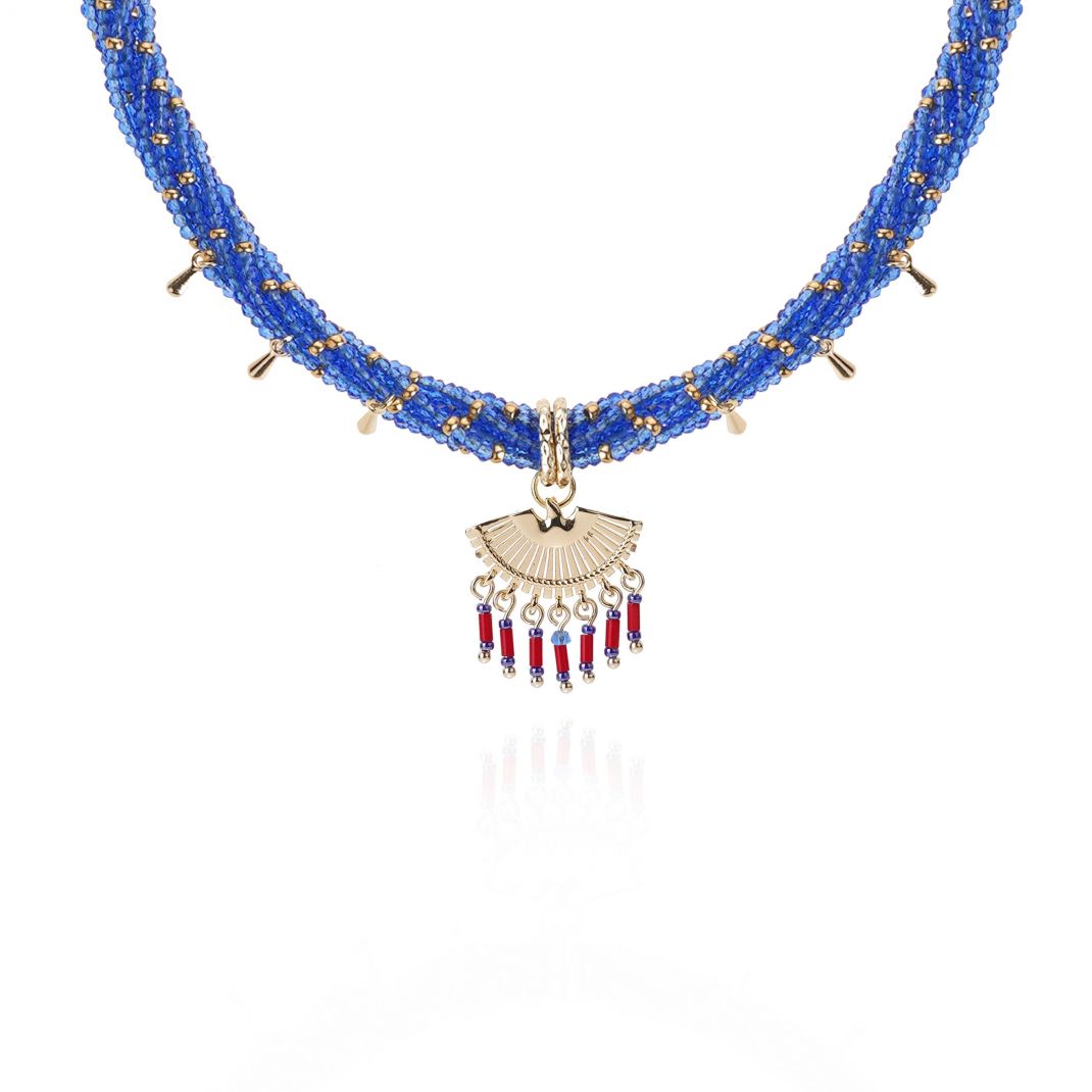 The BILKIS necklace, a delicate piece of jewelry gilded with 14-carat fine gold, transports us to Amerindian lands, an essential source of inspiration in the HIPANEMA universe. Offered in three color variants - black, gold and blue - the blue version features a blue textile braid, adorned with carefully stitched gold beads and six meticulous pendants. At its center is the collection's emblematic eagle, entirely hand-worked, unfurling a tail adorned with tubular beads arranged in a style evoking the Navajo aesthetic.