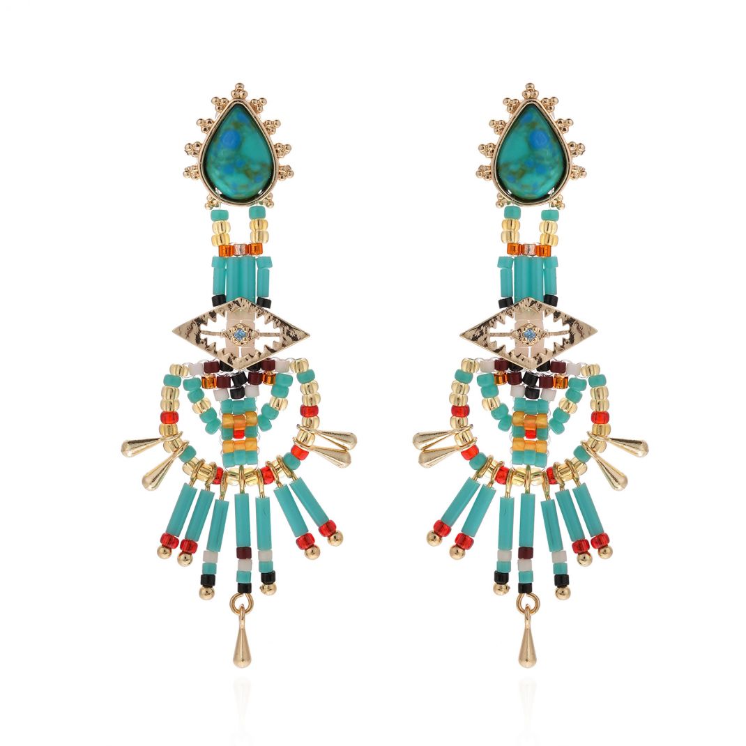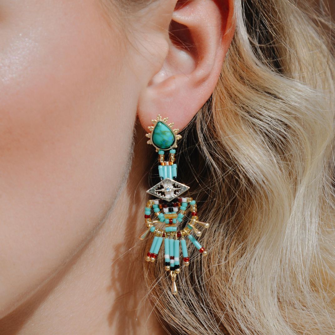 Inspired by Navajo aesthetics and a primitive interpretation of volumes, HALBA earrings, gilded with 14-carat fine gold, are offered in two colors. The turquoise version perfectly embodies the emblematic nuances of Navajo style, in a totem of turquoise, amber and gold hues. It is adorned with a drop-shaped cabochon and a cascade of pearls, suspended from a diamond-shaped metal piece.