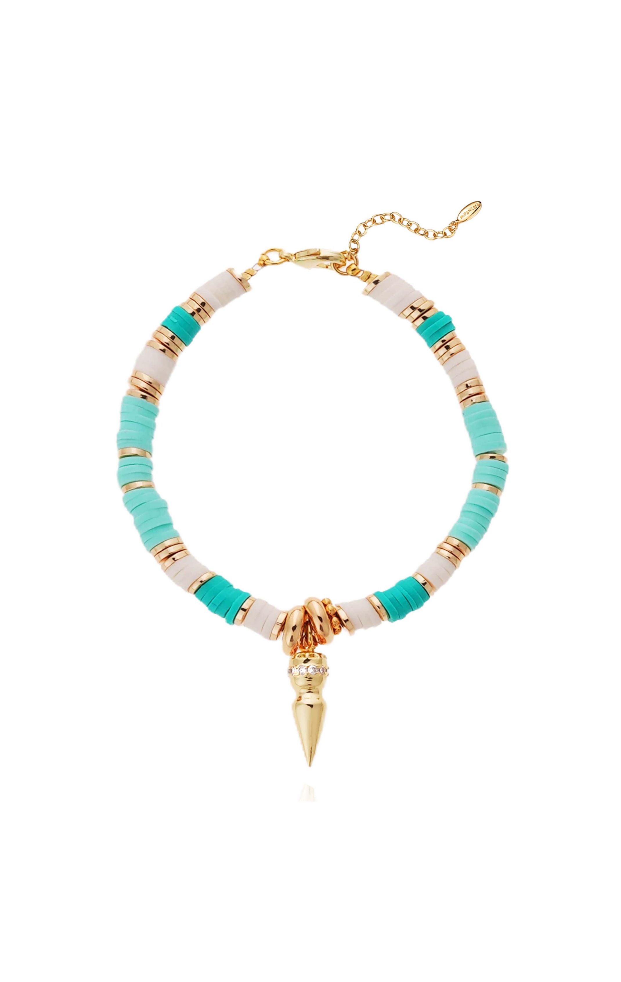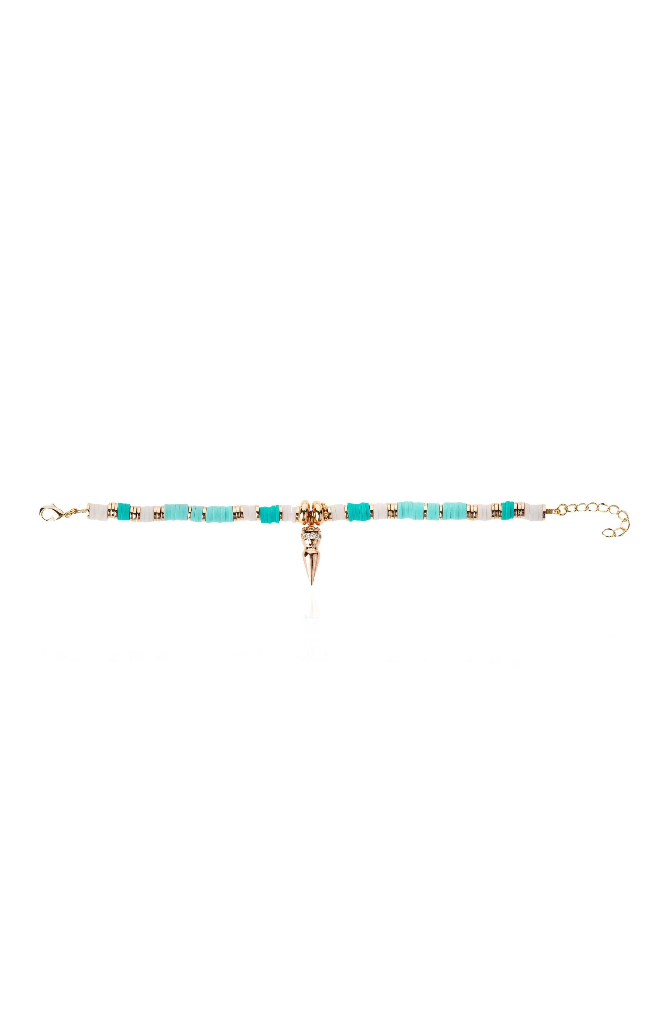 The Bangalor aqua bracelet plays the block color card, with a dominant aqua green color supported by regular glass and lapis rondelles, and a few gold and white rondelles on either side of a stylized gold tip charm meticulously worked by hand.