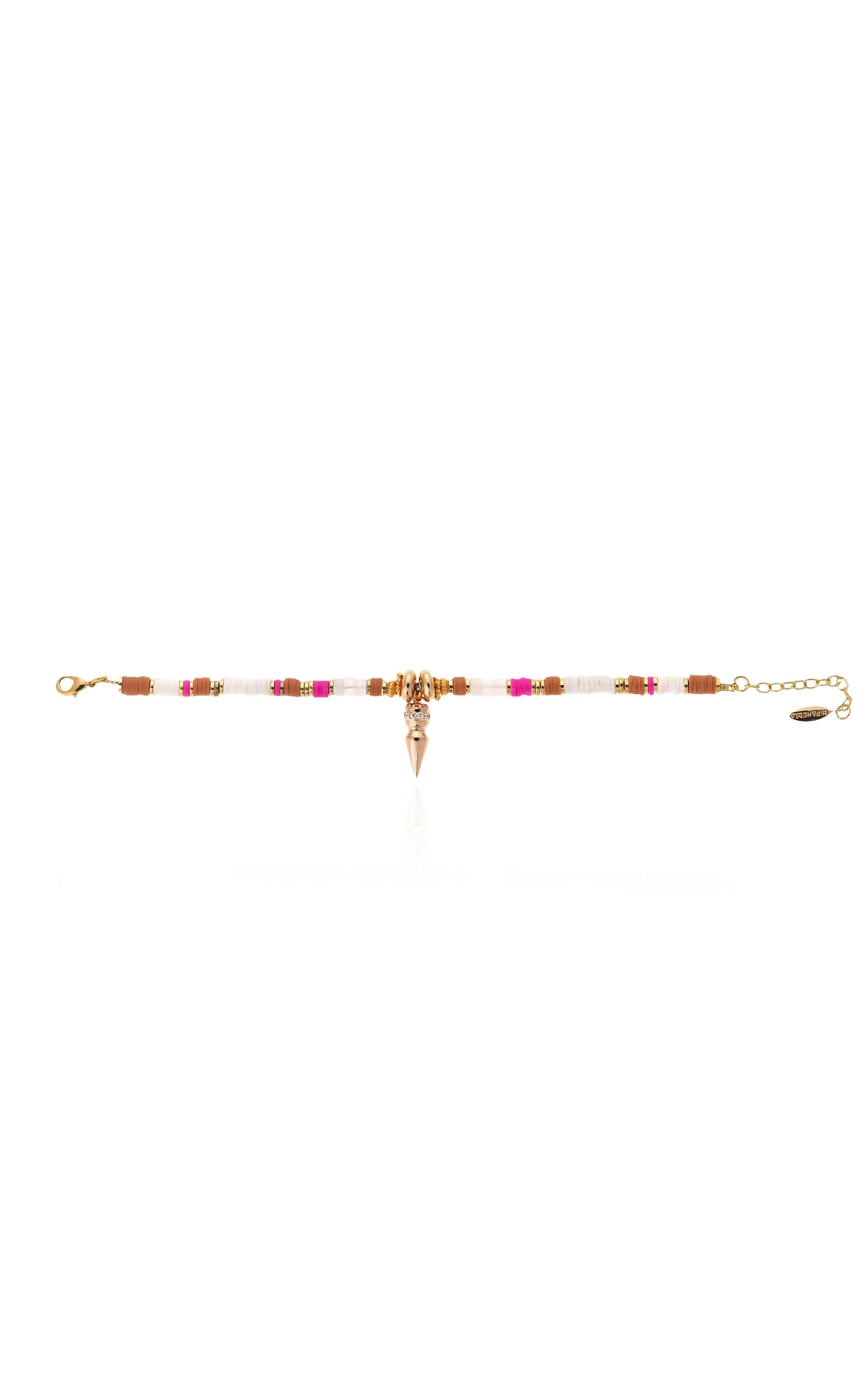 The Bangalor Camel bracelet alternates sequences of quartz and sea bamboo pearls, punctuated by Camel and hot pink silicone rondelles, which spread out on either side of a stylized gold-plated spiked charm meticulously crafted by hand.