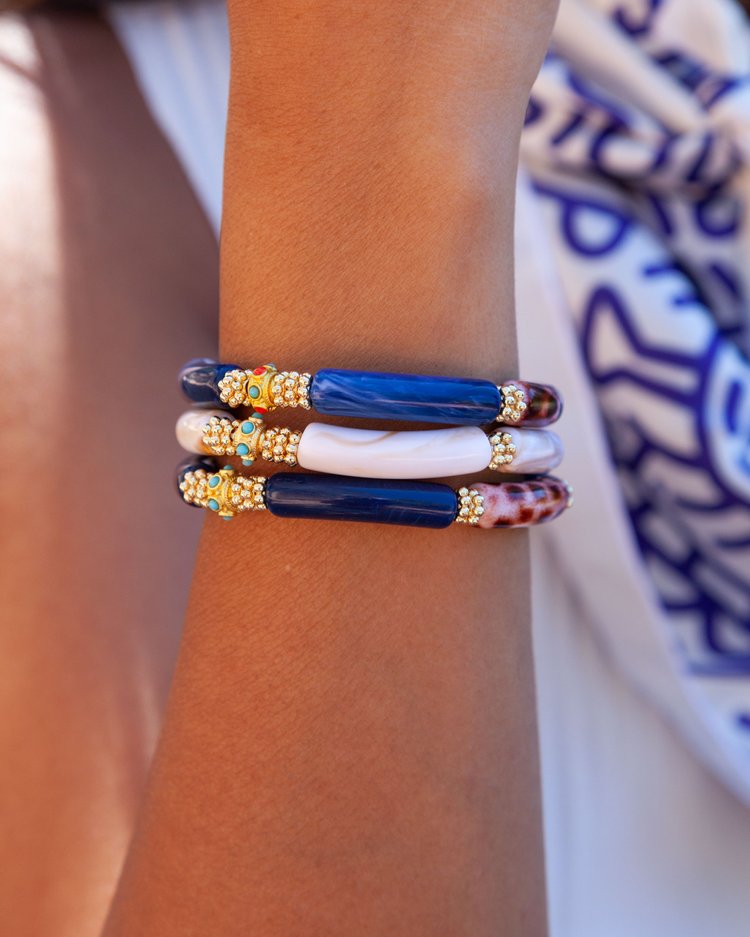 JUHU bracelets are made of acrylic beads, decorated with gold inserts and embellished with a colorful donut, mounted on a strong elastic thread.