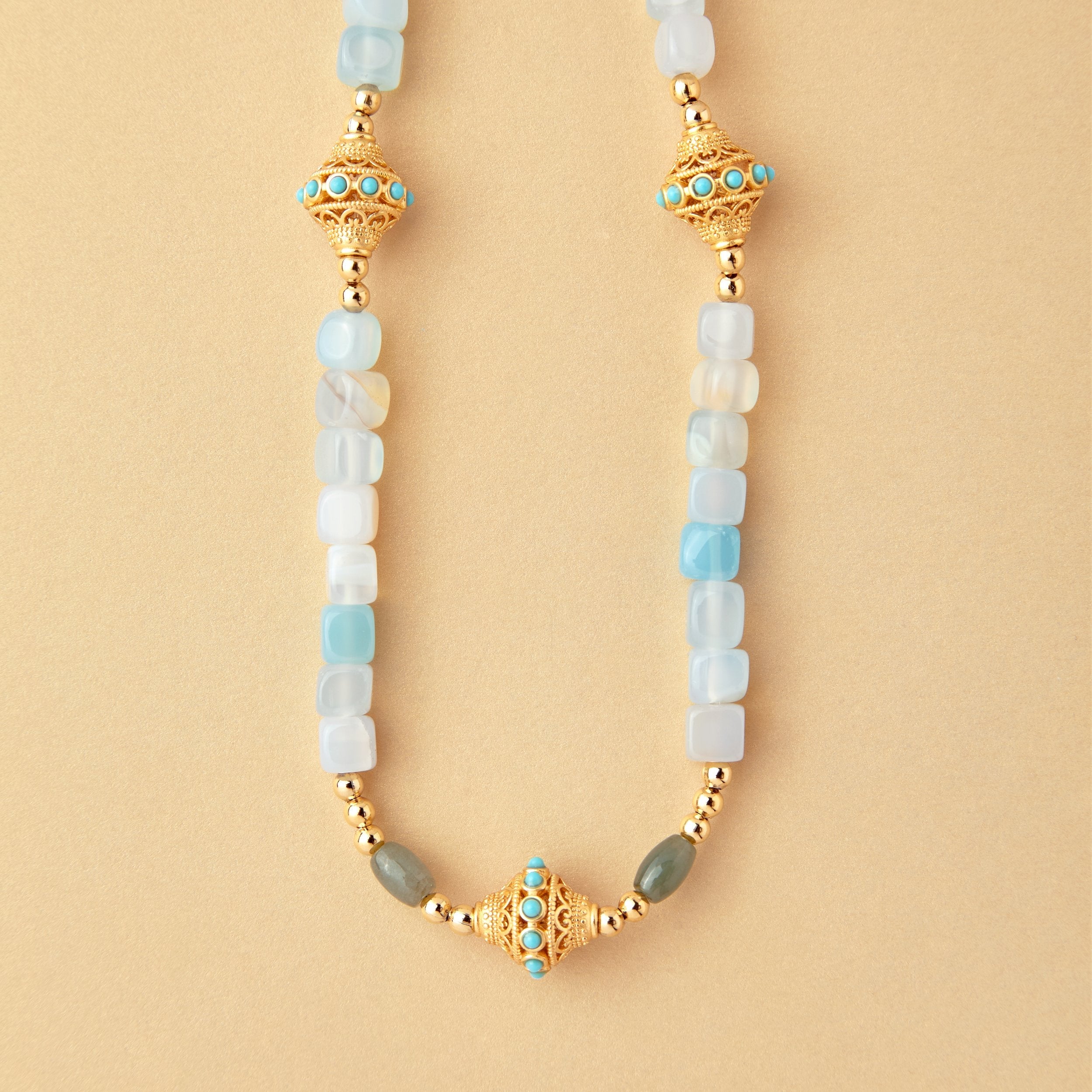 The Indian-inspired NESS necklace is an elegant creation, made with natural agate and jade stones.