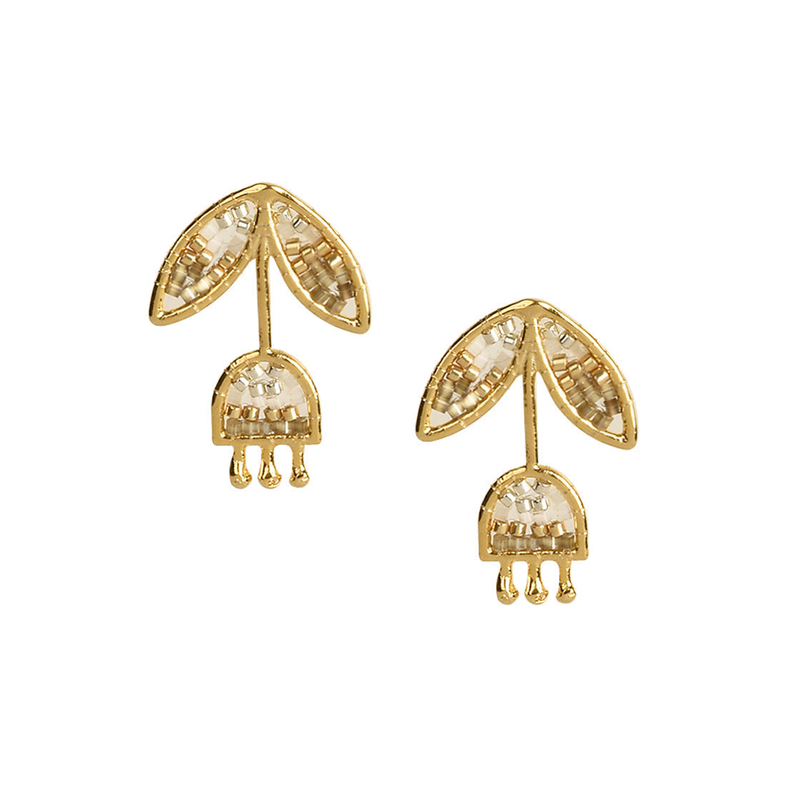 Japanese beads, nylon synthetic fiber thread, bronze gold plated tulip silhouette, bronze gold plated back earrings