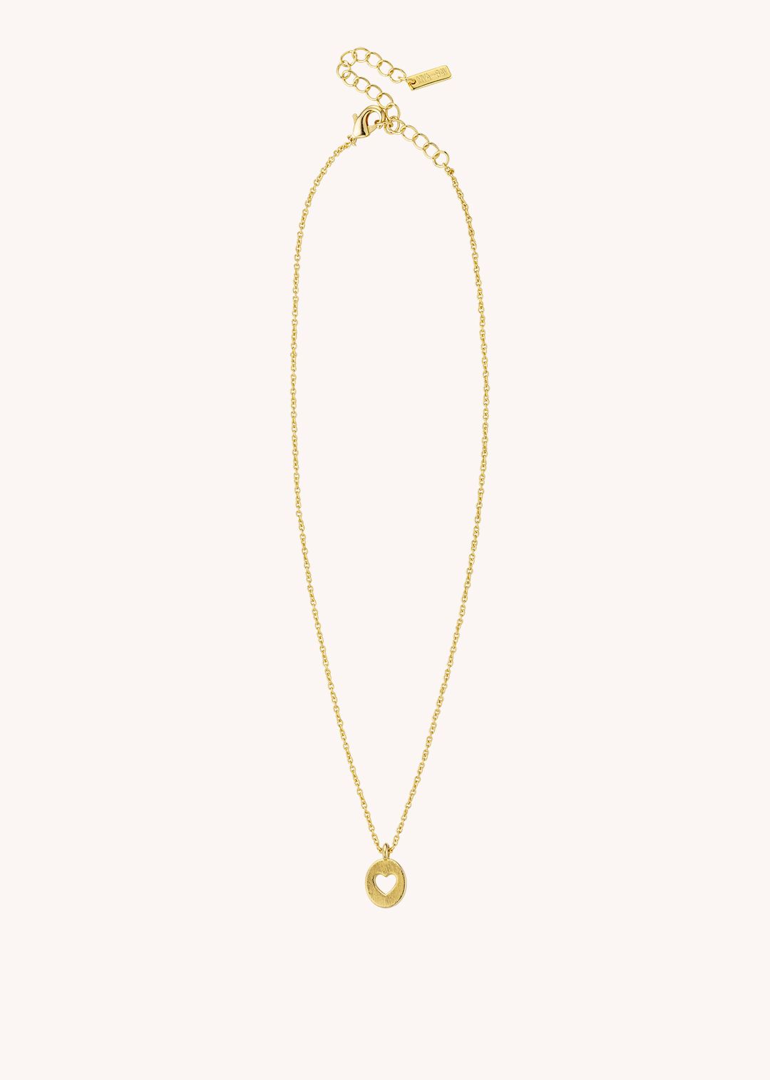 Its tiny brushed gold medallion, engraved with a delicate heart, hangs from a fine chain that catches the light softly. A subtle nod to love, in a bright and minimalist version.