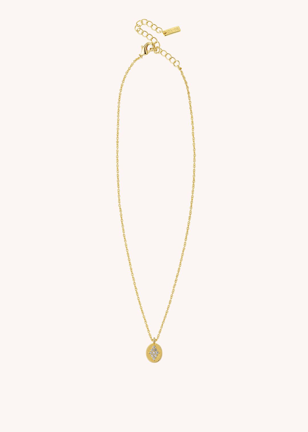 Its tiny brushed gold medallion, adorned with the BELLA motif, hangs from a fine shimmering chain. A graphic and minimalist piece, perfect solo or layered.