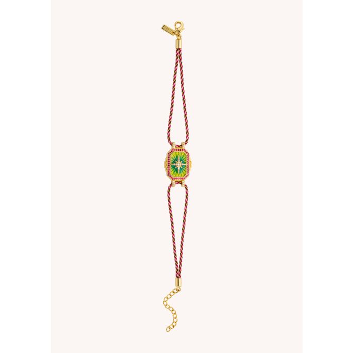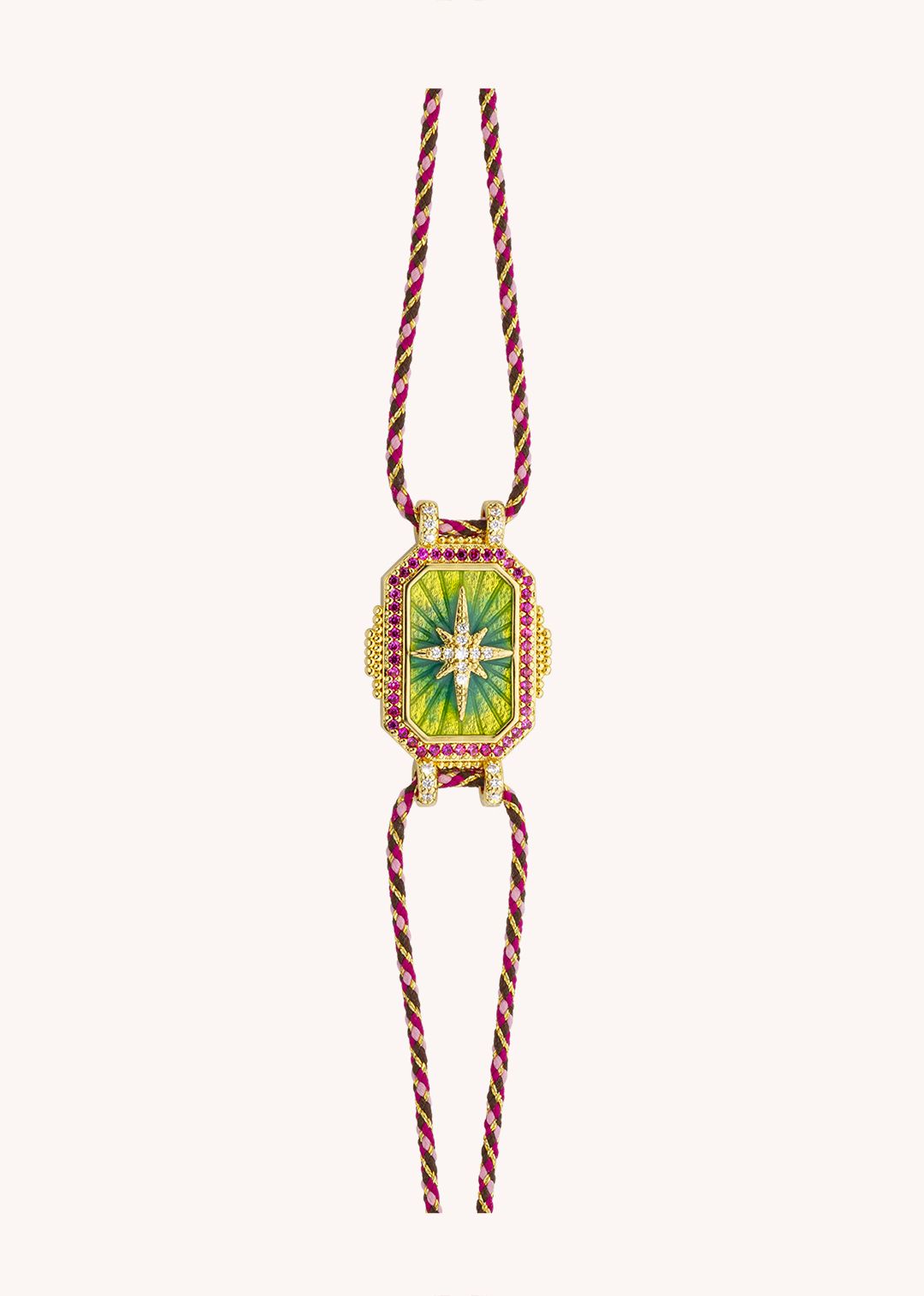Dive into the bohemian universe with this GREEN DIWALI BOHEME bracelet. Both delicate and daring, this MYA-BAY bracelet embodies the free and creative spirit of the collection. It features an enamel plate with our Diwali star at its center, surrounded by fuchsia gemstones. Hanging from this plaque is a braided cord in shades of brown, pink and gold.