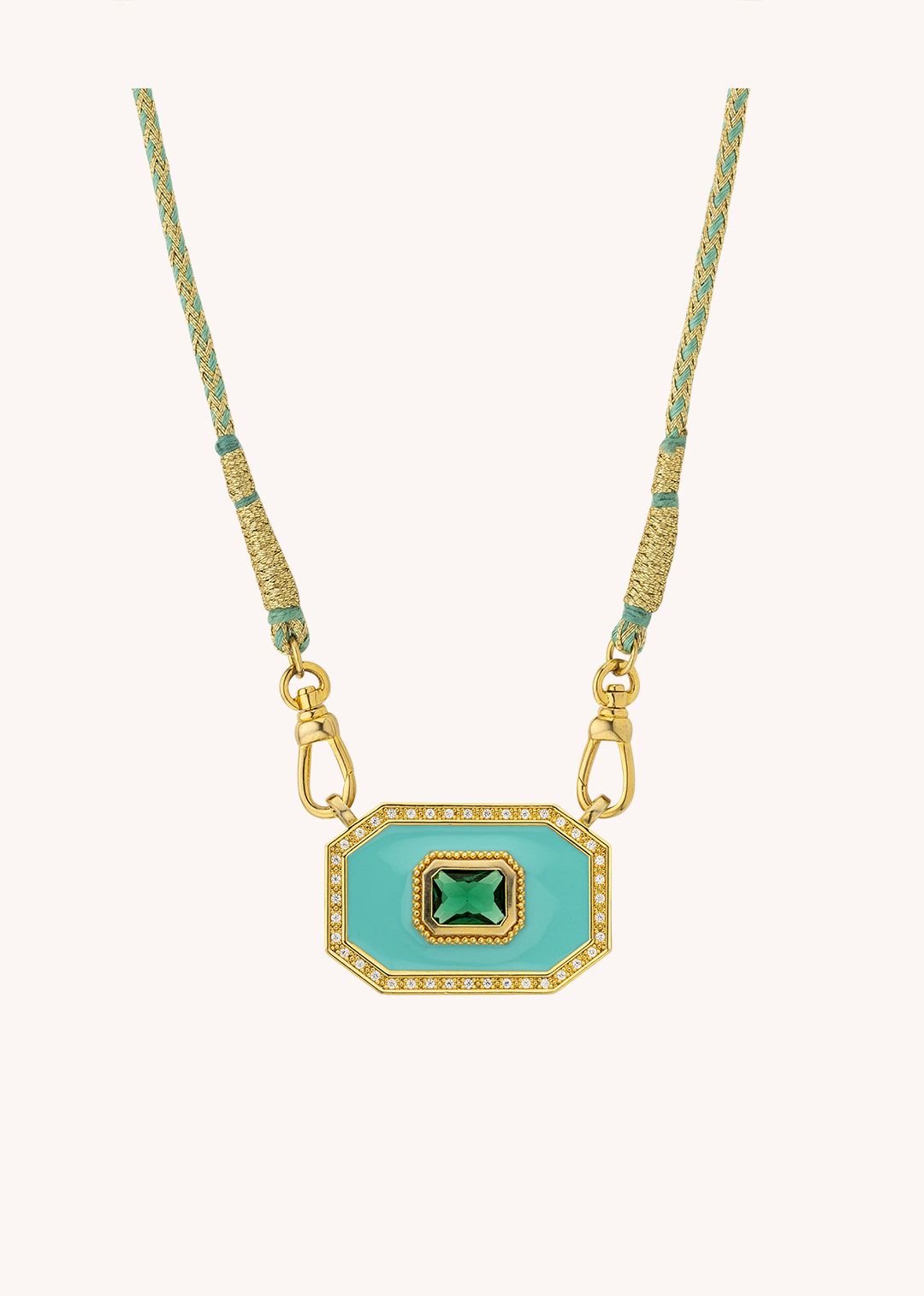This MYA-BAY necklace, gilded with 24k recycled fine gold, combines turquoise enamel and a vibrant green stone.