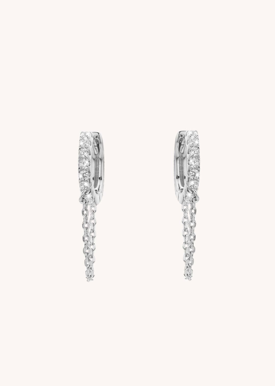 The rings of these earrings are decorated with gems to bring light to this jewel, followed by a thin chain that hangs to its clasp.