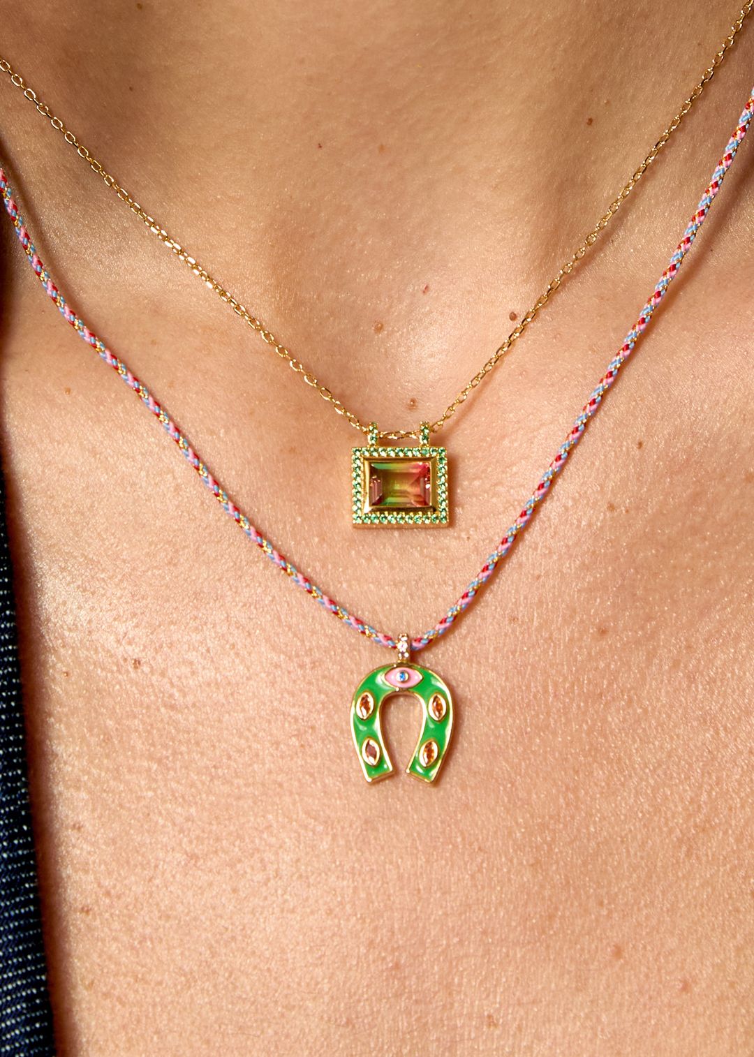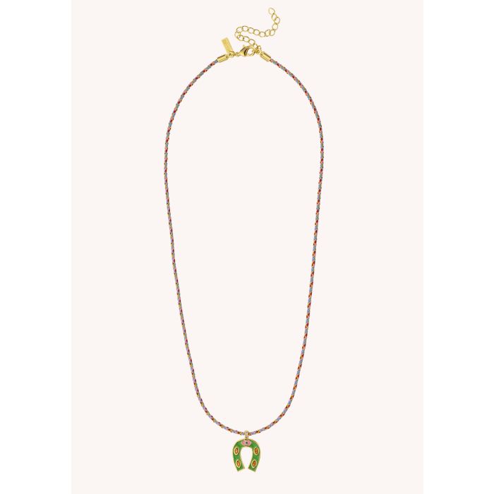 The GREEN MINI HORSESHOE necklace by MYA-BAY is gilded with recycled 24-carat fine gold. Its small horseshoe pendant features bright green enamel — a symbol of luck, success, and positive energy. Mounted on a cord, it measures 39 cm + 5 cm extension for a light, adjustable fit. Also available in PURPLE, ORANGE, FUCHSIA, or WHITE — collect them in your favorite colors or wear them with the larger HORSESHOE designs.