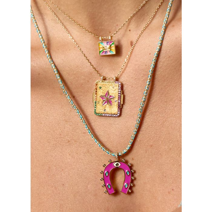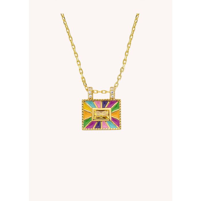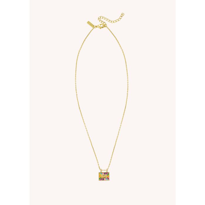 The RAINBOW EL PASO necklace by MYA-BAY is gilded with recycled 24-carat fine gold. Its multicolored enamel rectangle recalls a sunset over the Texan desert — intense, fiery, unforgettable. It measures 38 cm + 5 cm extension, adjustable to your liking. A bold statement piece that instantly brings joy and style to any outfit. Explore the rest of the EL PASO collection to complete your personal rainbow: RUBY WATERMELON, GREEN WATERMELON, or BLACK AND WHITE are waiting for you.