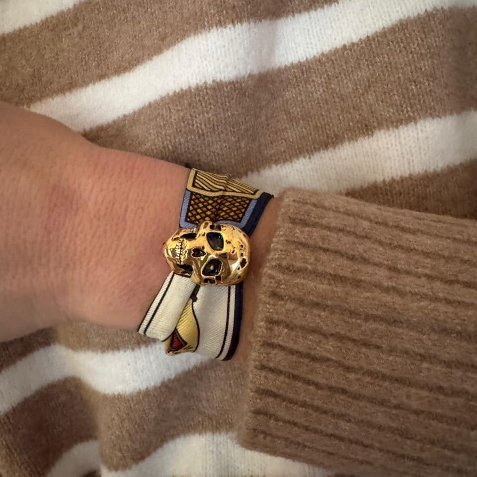 The Pirate Cuff features a sculpted skull motif paired with a silk ribbon bracelet.