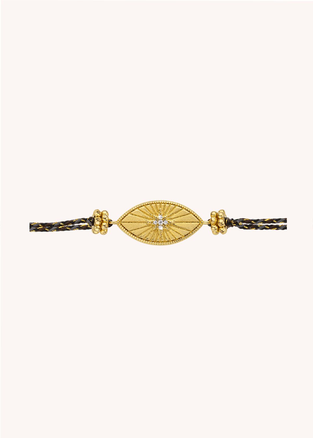The DIWALI IRIS bracelet by MYA BAY is a bold blend of style and symbolic strength. With its black cord woven with golden threads, it echoes the shape of a protective eye — and the belt of a boxer, a nod to our ROUND ONE collection.