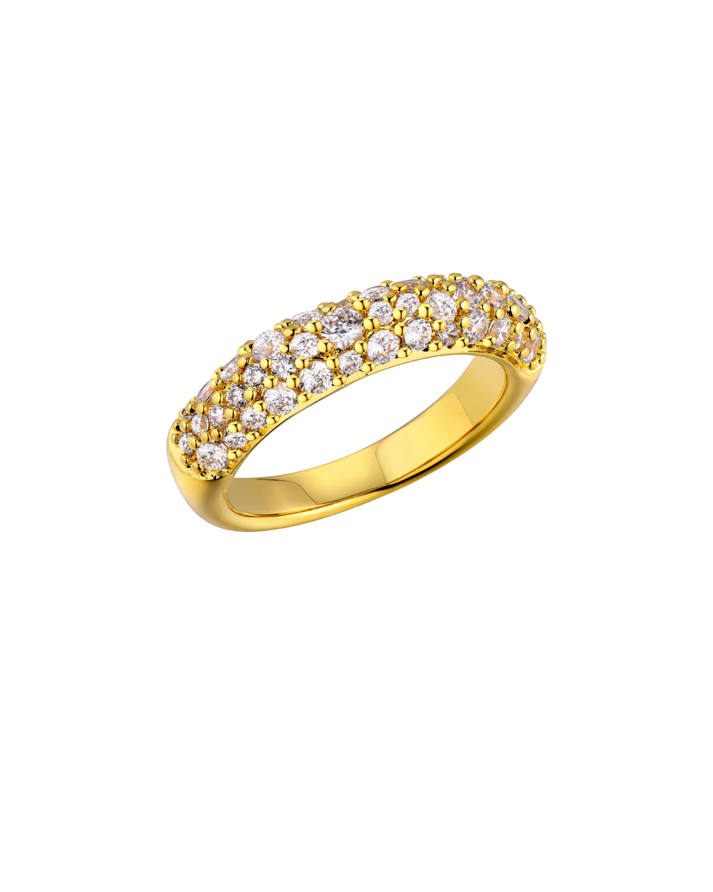 The CHAMPAGNE ring by MYA—BAY, gilded with 24-carat recycled fine gold or crafted in recycled rhodium-plated silver, is inspired by the earrings of the same name. With its sparkling rhinestones and bold design, it brings a festive shine and a touch of glamour to any outfit.