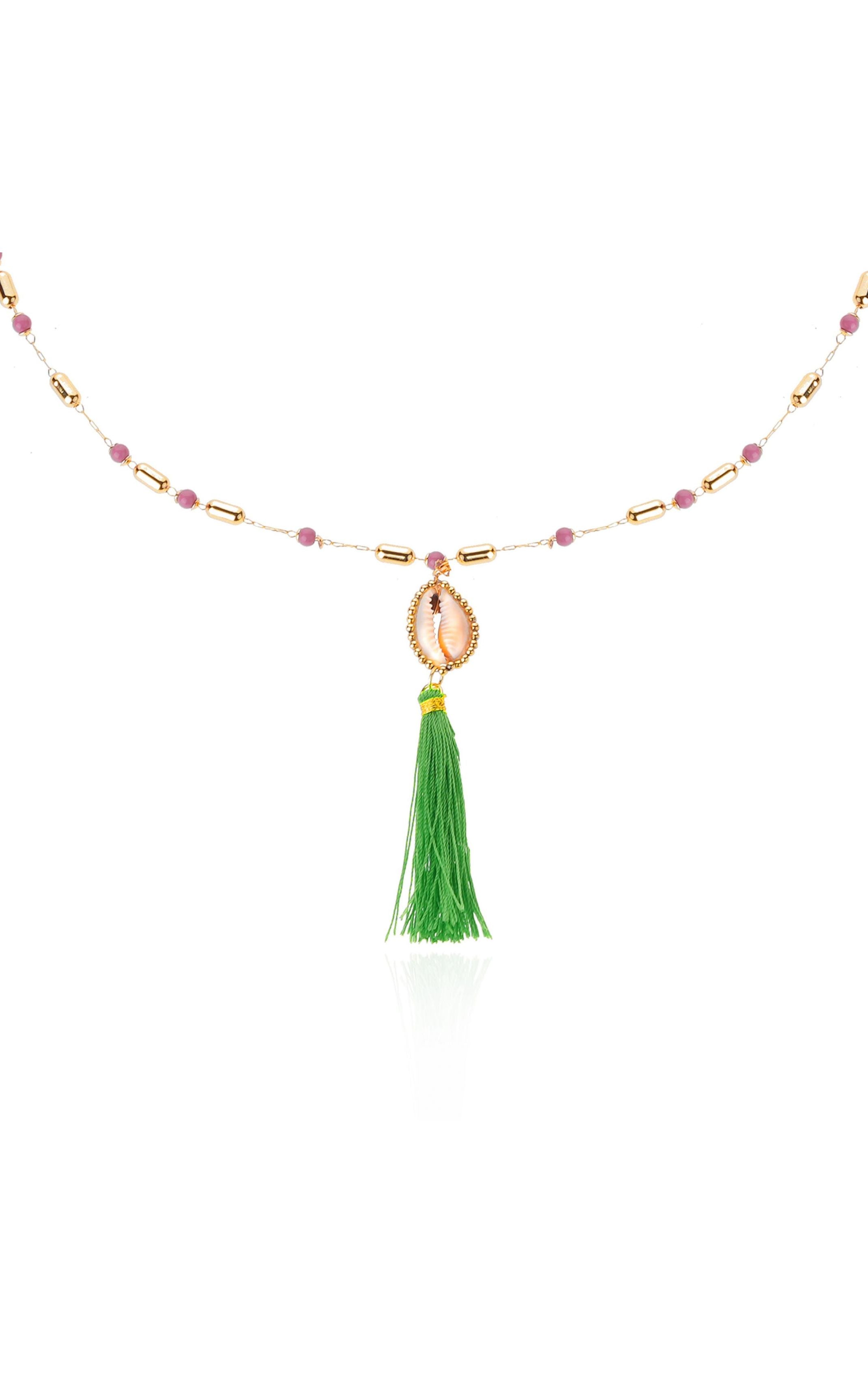Between joyful belief, solar gri-gris, a dazzling palette of colors and extravagant shapes, discover our Brazil theme and our Tamara necklace! A long necklace mounted on a rosary chain reinterpreted with alternating oval and round gold and coral beads, the Tamara necklace is adorned with a cori encircled with gold ball beads and a large prairie-green pompom that looks like a colorful, joyful gri-gris. Available in four colors, you can wear it proudly around your neck, like a precious, tangy treasure.