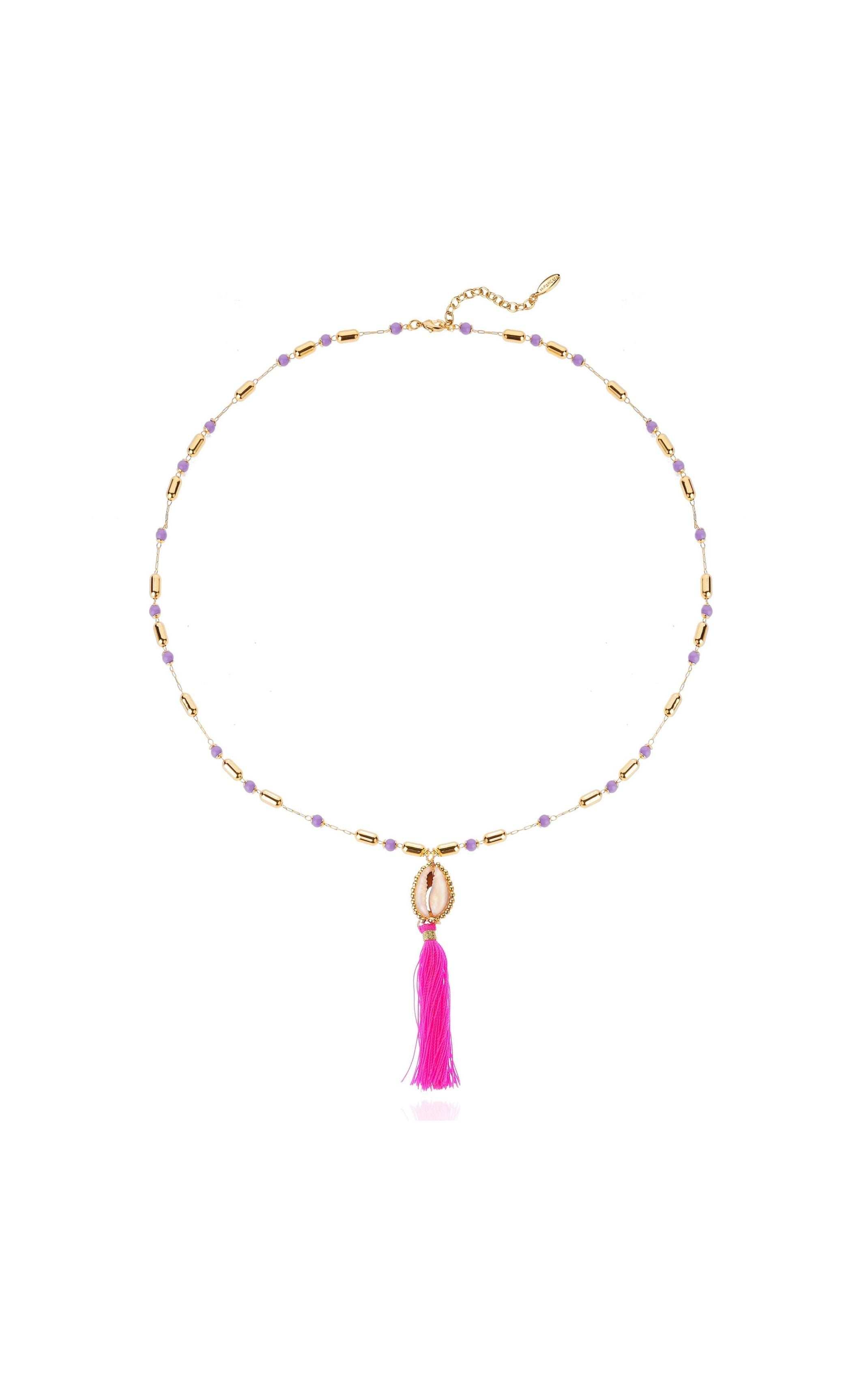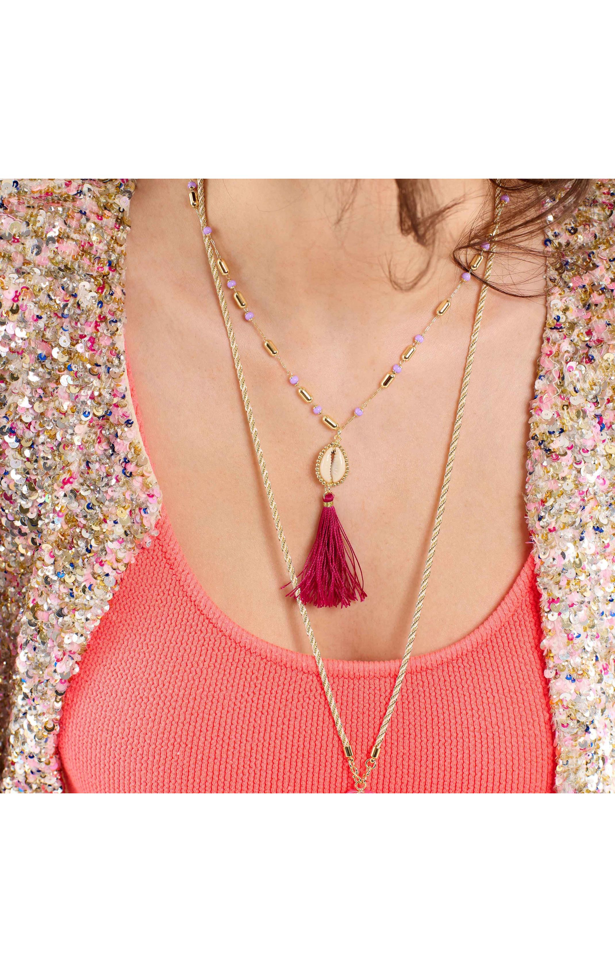 Between joyful belief, solar gri-gris, a dazzling palette of colors and extravagant shapes, discover our Brazil theme and our Tamara necklace! A long necklace mounted on a rosary chain reinterpreted with alternating oval and round gold and coral beads, the Tamara necklace is adorned with a cori encircled with gold ball beads and a large prairie-green pompom that looks like a colorful, joyful gri-gris. Available in four colors, you can wear it proudly around your neck, like a precious, tangy treasure.