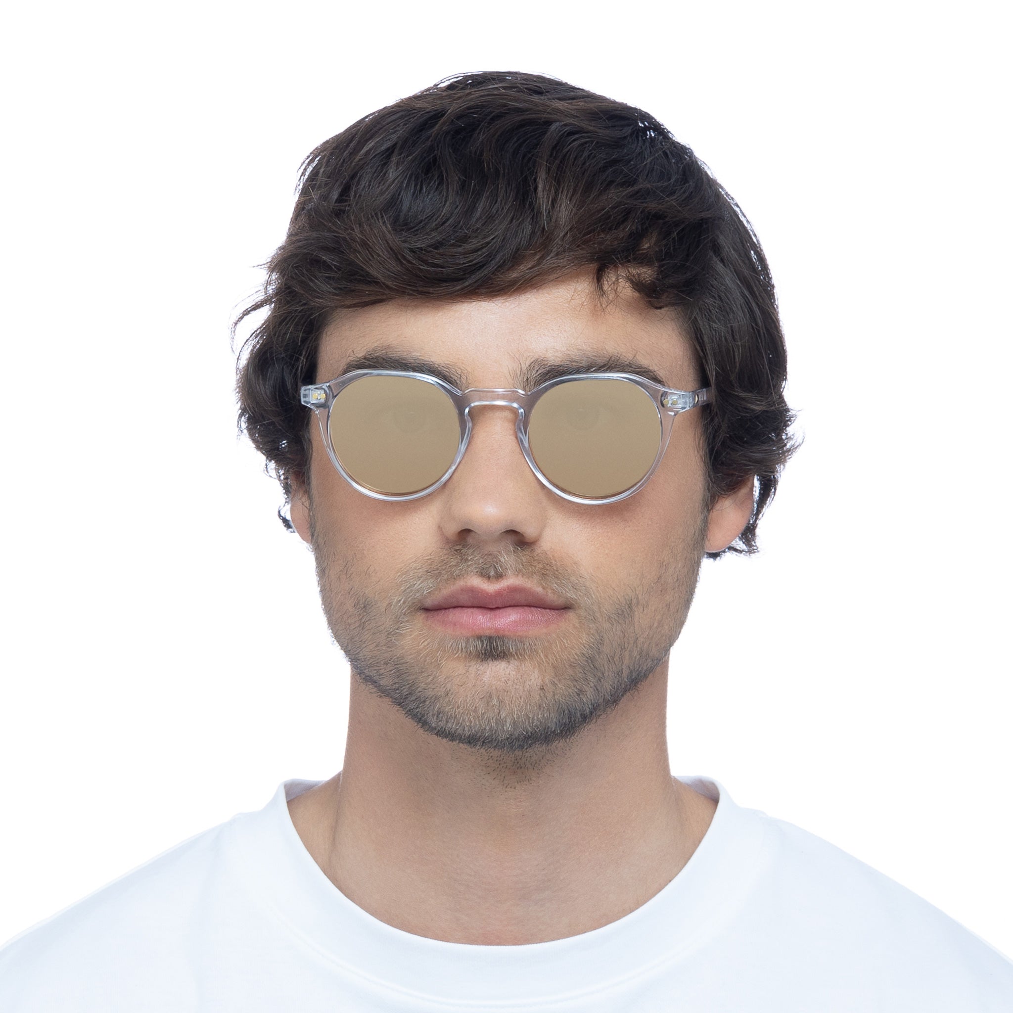Finished in a translucent clear frame with contrast bronze mirror lenses.