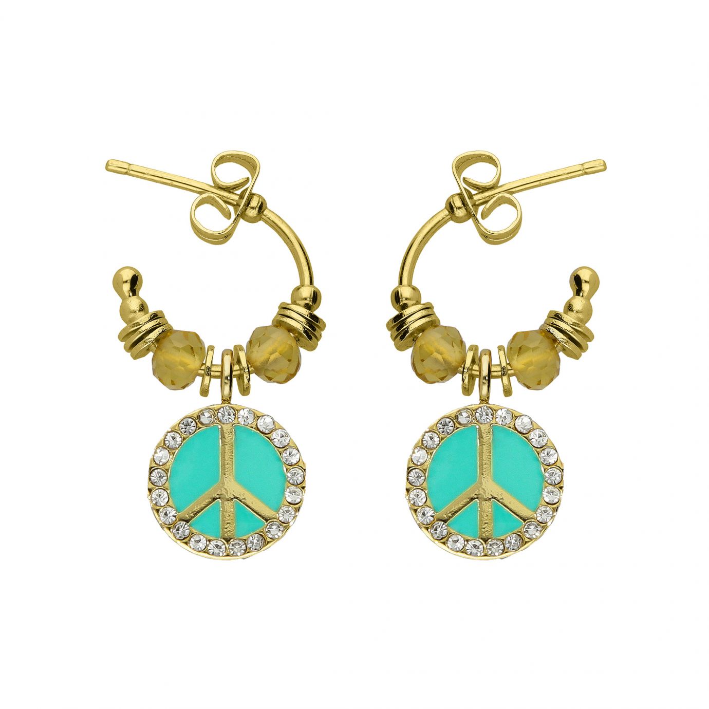 Small hoop-shaped earrings, gilded with fine 14 carat gold. They are decorated with a small central tassel in turquoise enamel bearing the peace and love symbol surrounded by diamond-effect rhinestones. They are enhanced with two faceted ocher pearls.
