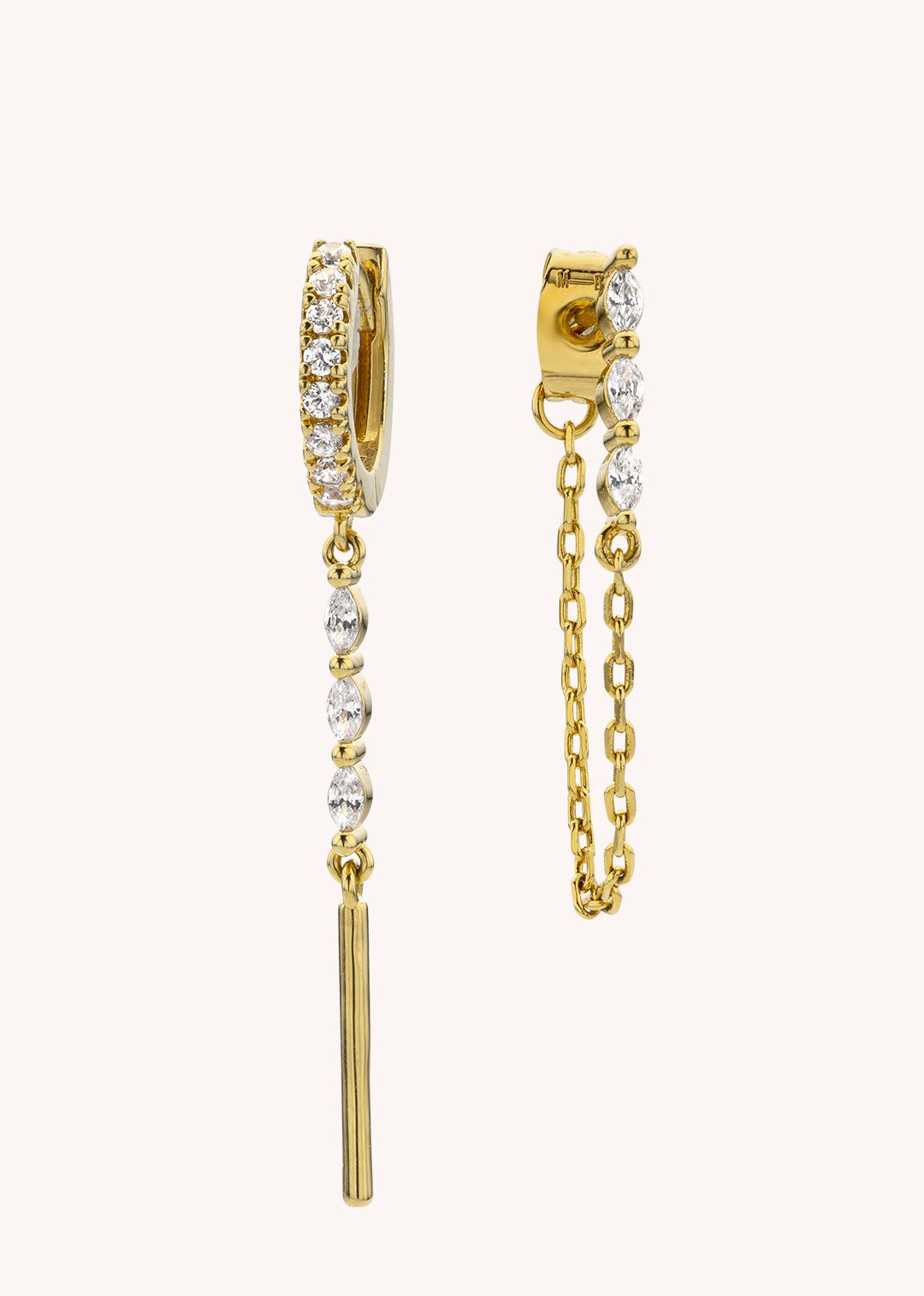 Mismatched and linear, they feature subtle zircon accents that gently catch the light. A vertical silhouette full of grace, elongating the neckline with understated charm.