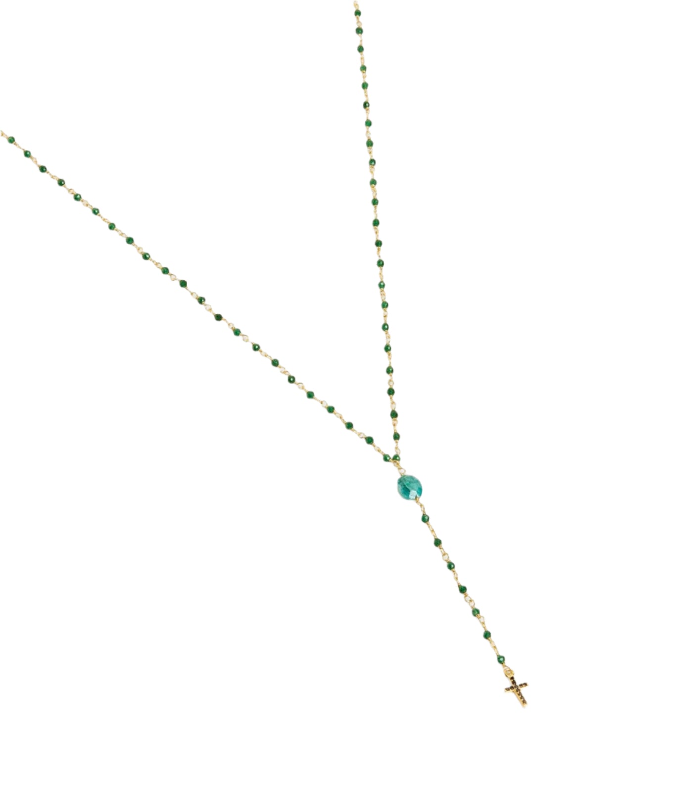 This adjustable ruby ??zoisite stone cross rosary from India is a bohemian chic, refined, and timeless piece of jewelry. It is ideal for a special occasion or for everyday wear. It is composed of mystic emerald beads, a 1cm cross encrusted with black zircons as a pendant, and a brass chain gilded with 18-carat fine gold.