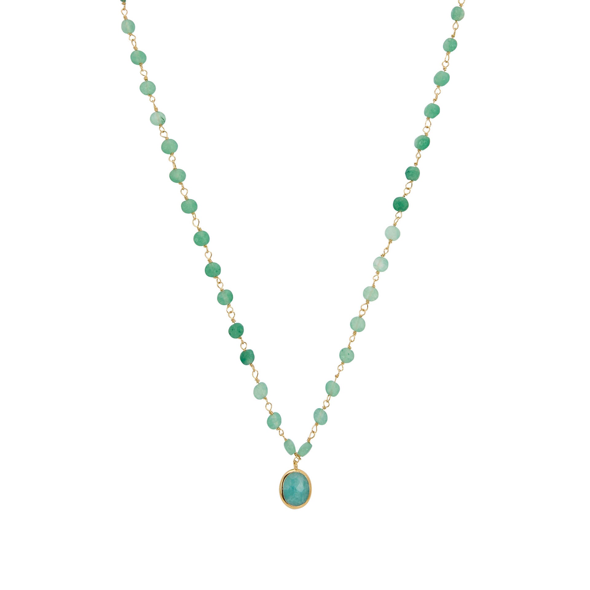 Immerse yourself in exotic elegance with the Inde Alwar long necklace. At 65 cm long, this reimagined chain showcases oval and flat green onyx stones, carefully selected for their unique brilliance. The piece is finished with a magnificent Amazonite pendant, adding a warm and refined finishing touch.