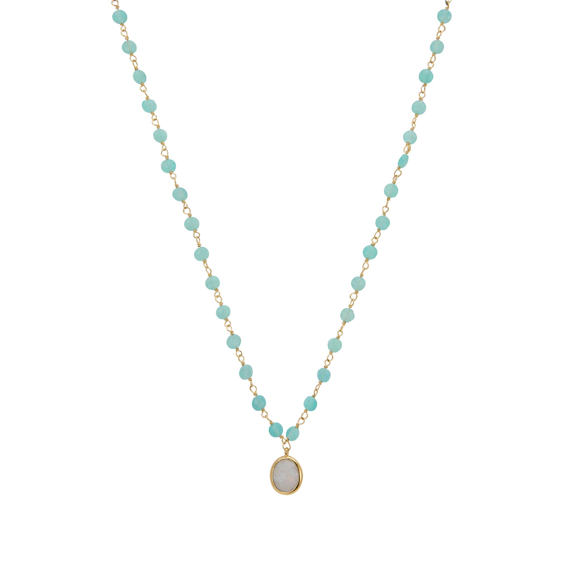 Immerse yourself in exotic elegance with the Inde Alwar long necklace. At 65 cm long, this reimagined chain showcases oval and flat Amazonite stones, carefully selected for their unique brilliance. The piece is finished with a beautiful white moonstone pendant, adding a warm and refined finishing touch.
