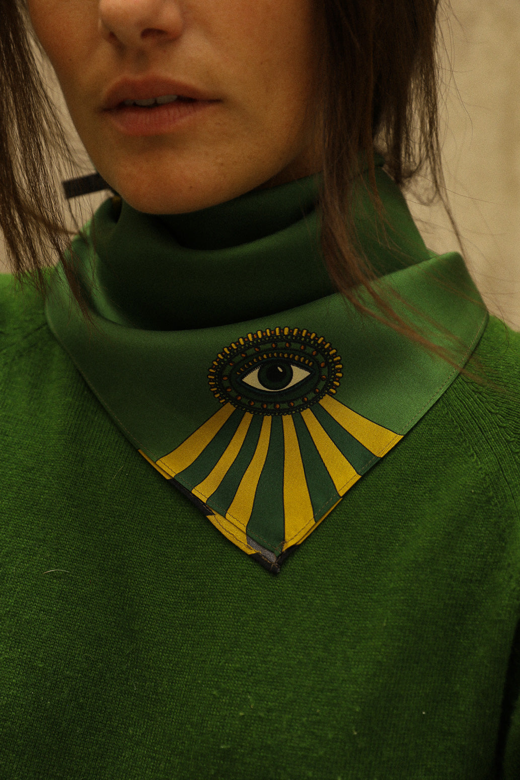 A small square scarf in rich green tones, designed as a refined lucky charm. Its 55 × 55 cm size makes it perfect for wearing around the neck, tying to a bag, or styling as a subtle accent.