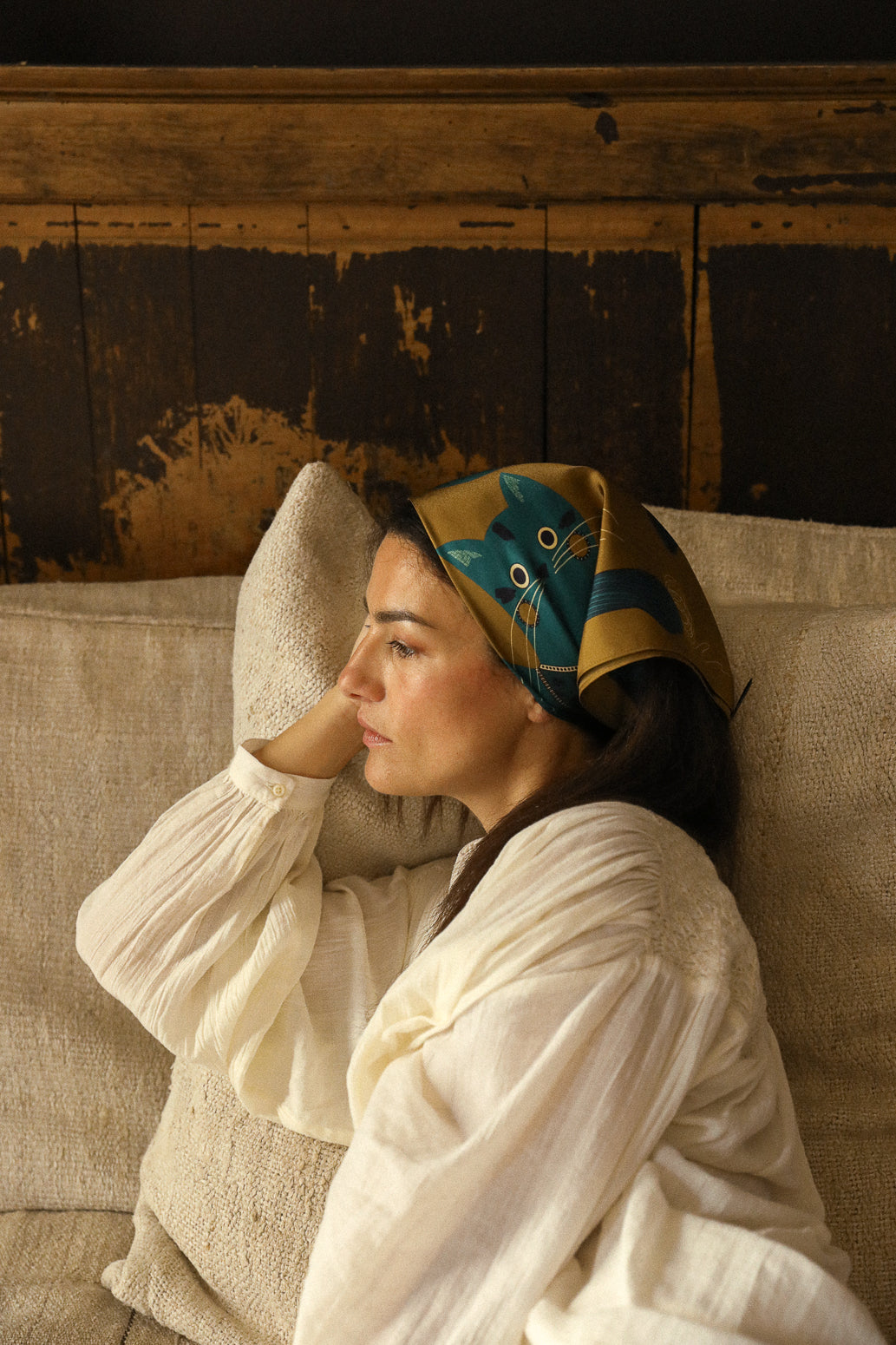 A small square scarf in warm, earthy tones, featuring a playful illustrated cat motif. Its 55 × 55 cm size makes it ideal for styling around the neck, tying in the hair, or adding a graphic touch to a bag.
