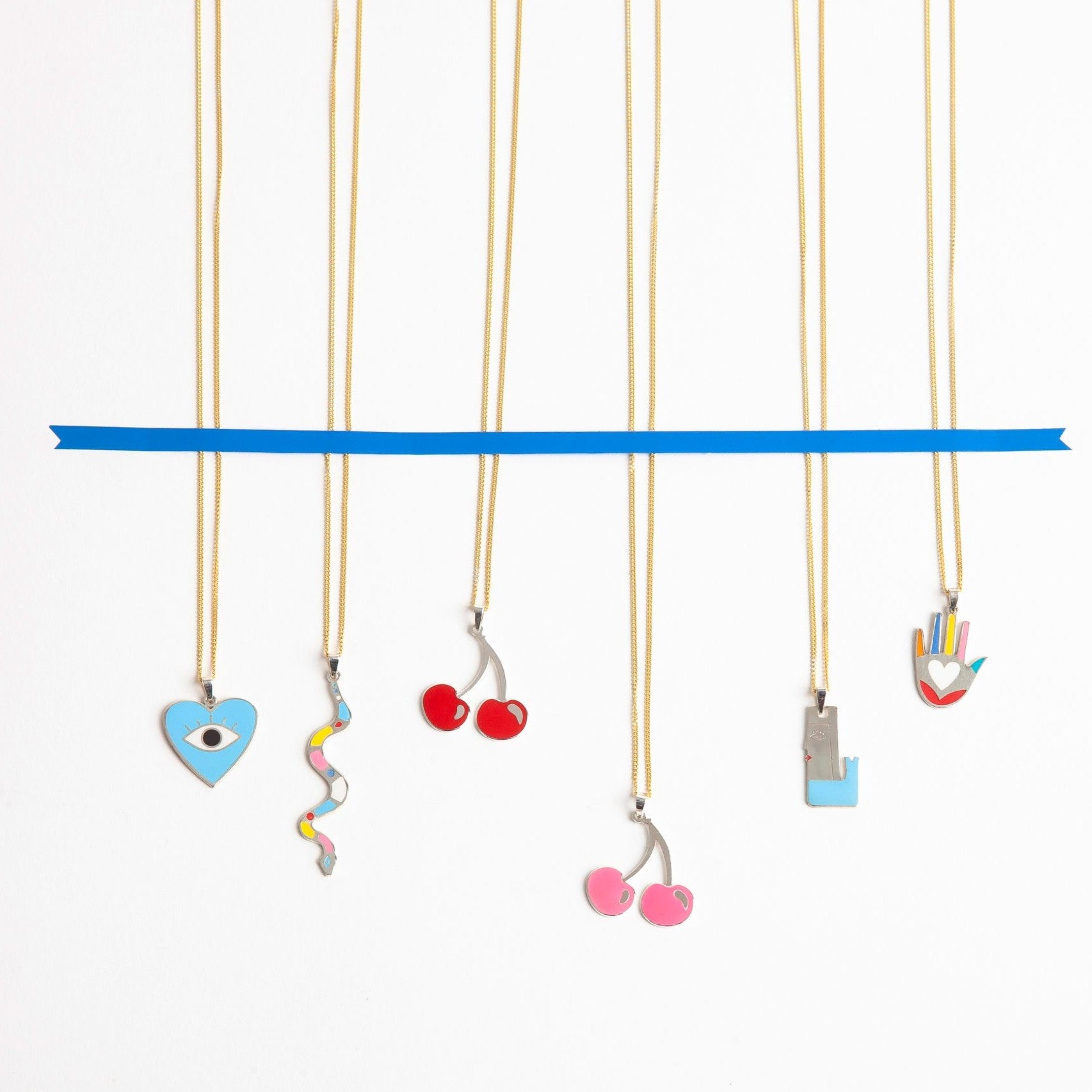 The Lucky Charms collection has many different designs. Each of them represent different aspects of reality in an abstract way. The collection is made entirely of silver 925, ceramic color and gold or platimun plated chain.