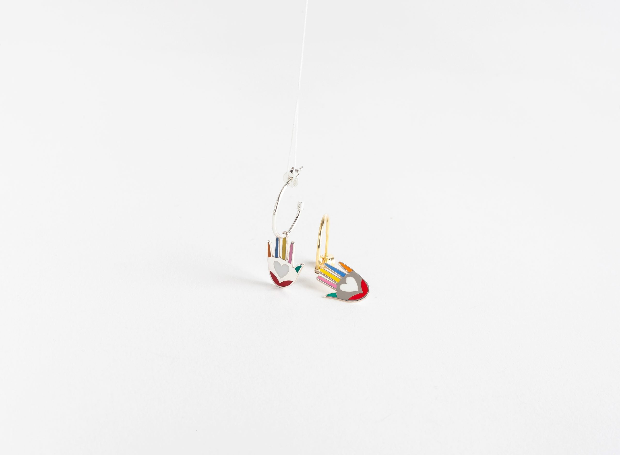 The lucky charms is our brand new pendants earrings collection for 2025. The collection has 14 different designs. Each one represents a unique symbol of reality in an abstract way. The collection is made entirely of silver 925 and the colors are ceramic. The hoop is available at 2 options, silver or silver with gold plating.
