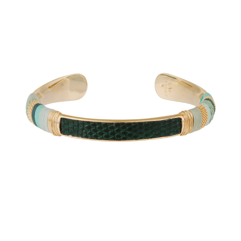 Gold plated bangle wrapped in polyester threads, gold wire and genuine dyed eather. The mix of vegetal and animal, organic and mineral invites you on a voyage. Adjustable size.