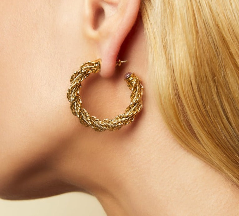Gold plated twisted earrings embellished with threads and adorned with delicate cabochons.