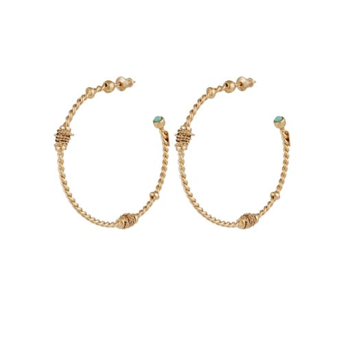Gold plated twisted hoop earrings embellished with threads and adorned with delicate cabochons.