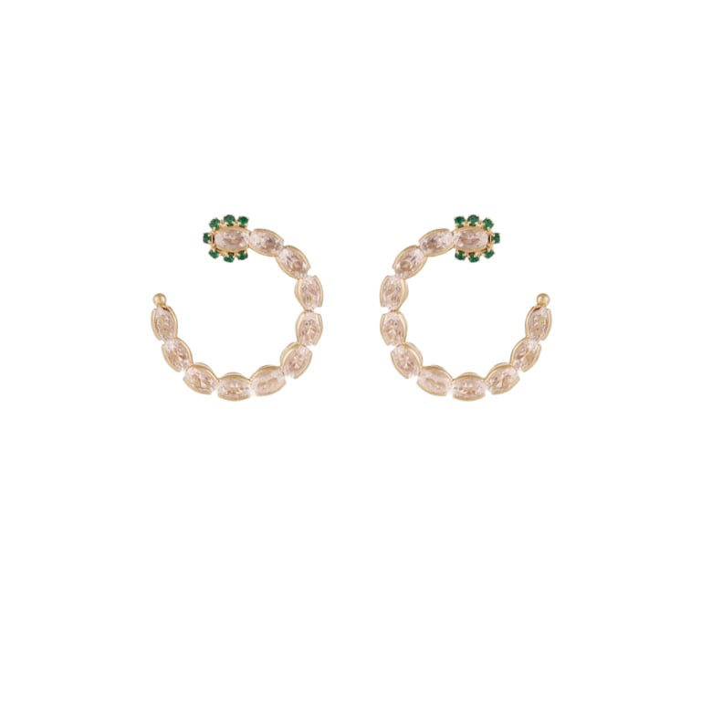 Gold plated hoop earrings embellished with elegants zirconias and a flower of emerald color.