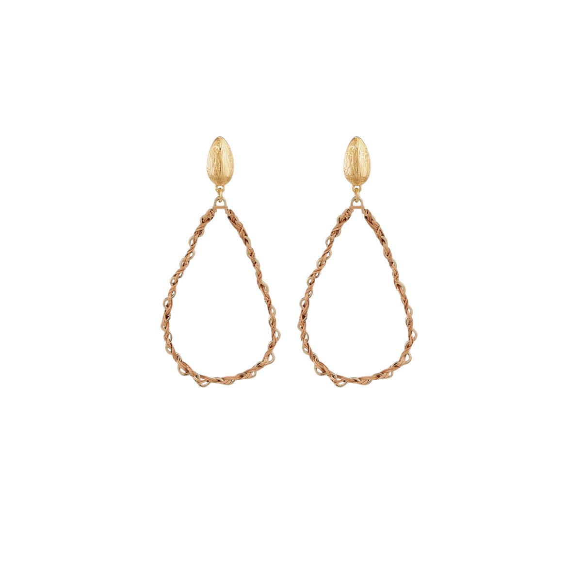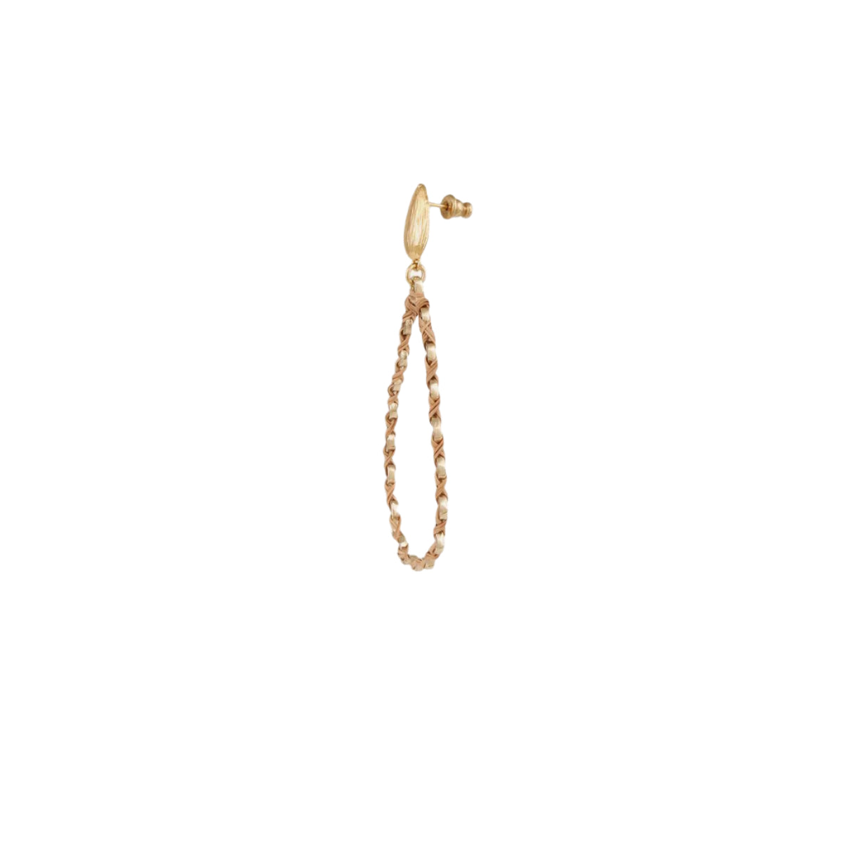 Gold-plated earrings, featuring a hammered drop, finely hand-woven with wicker.